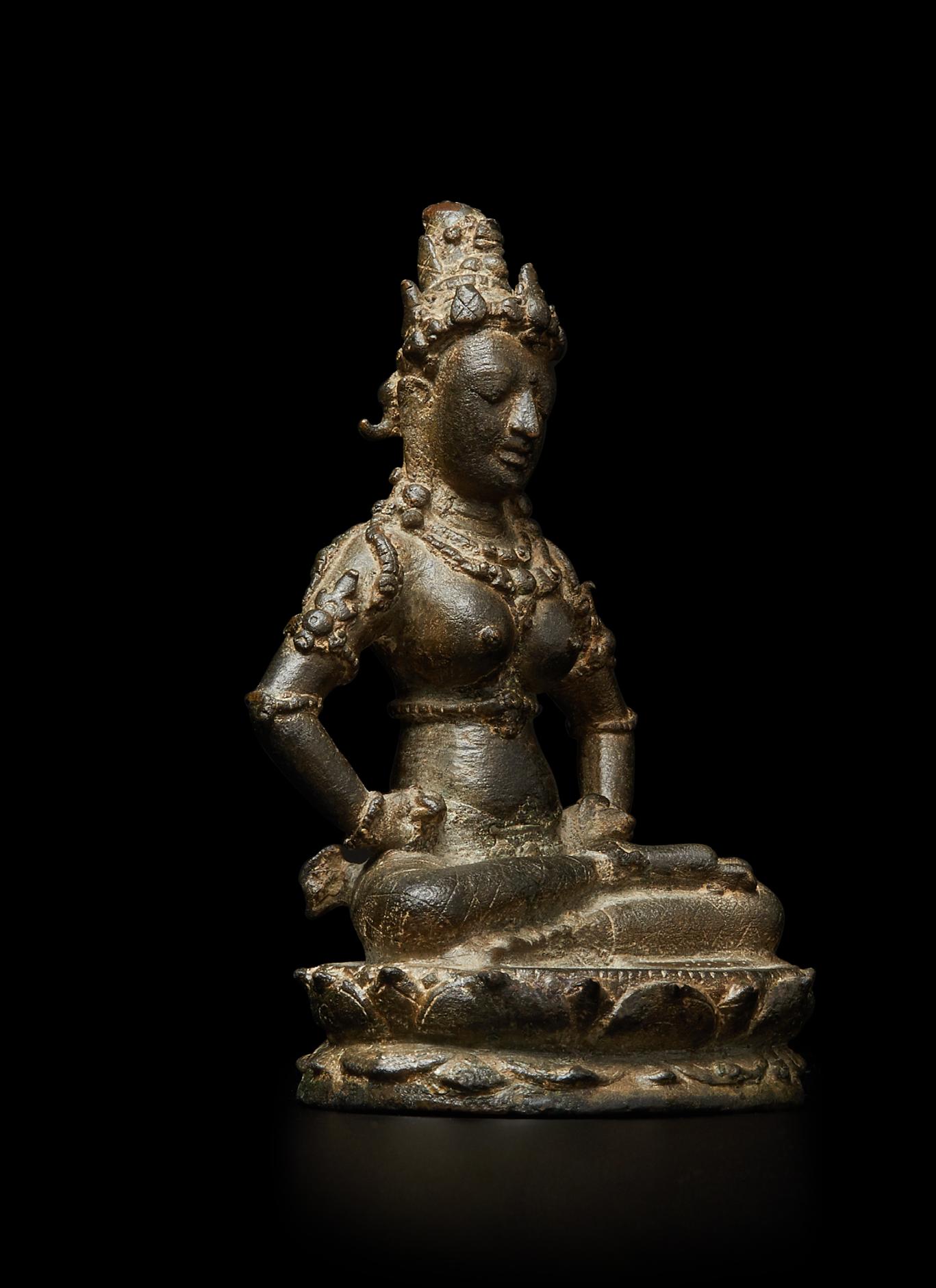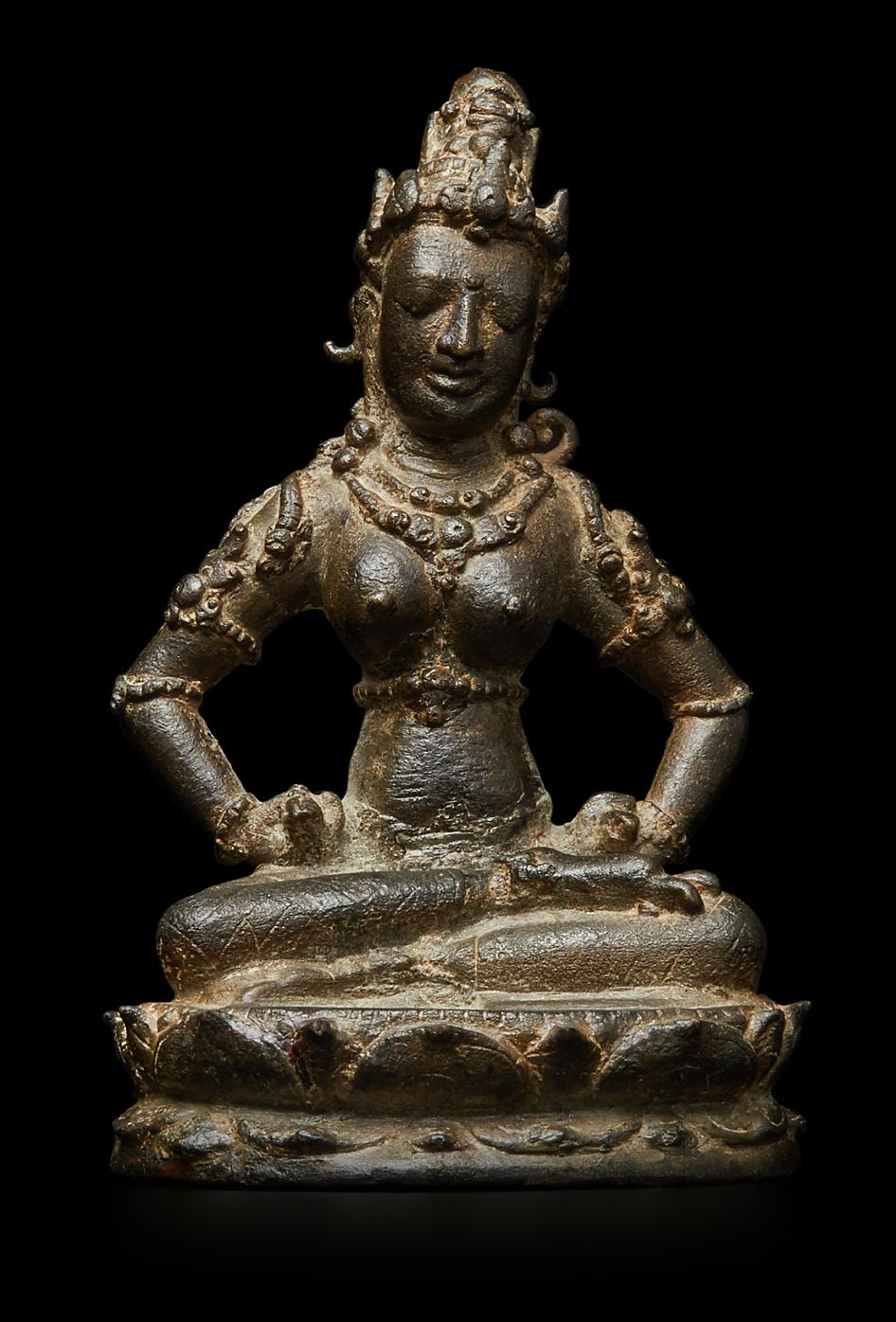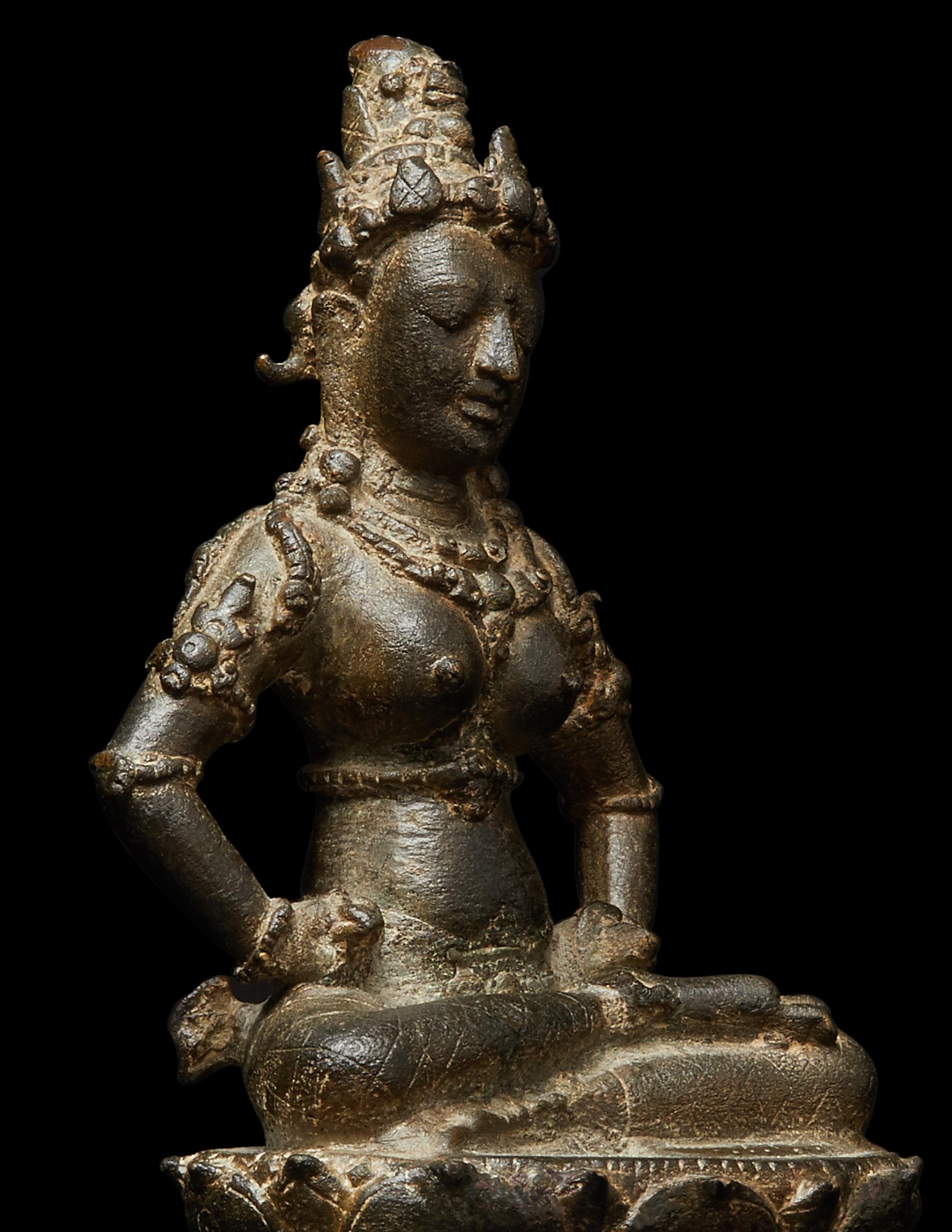 Esoteric Mahayana Buddhism was well grounded in the Indonesian archipelago by the seventh century, largely due to the influence of maritime trade. By the late tenth century eastern Java was an important center of patronage. The present bronze almost certainly comes from the most well-known hoard of Javanese sculptures, found in 1913 in the village of Chandirejo, in Nganjuk district in Eastern Java (see Lerner and Kossak, The Jewel in the Lotus, Metropolitan Museum of Art, 1991, p. 200). Many of the ninety-or-so sculptures ended up in museum collections, but some were immediately sold to private collectors and the present fell in that category.