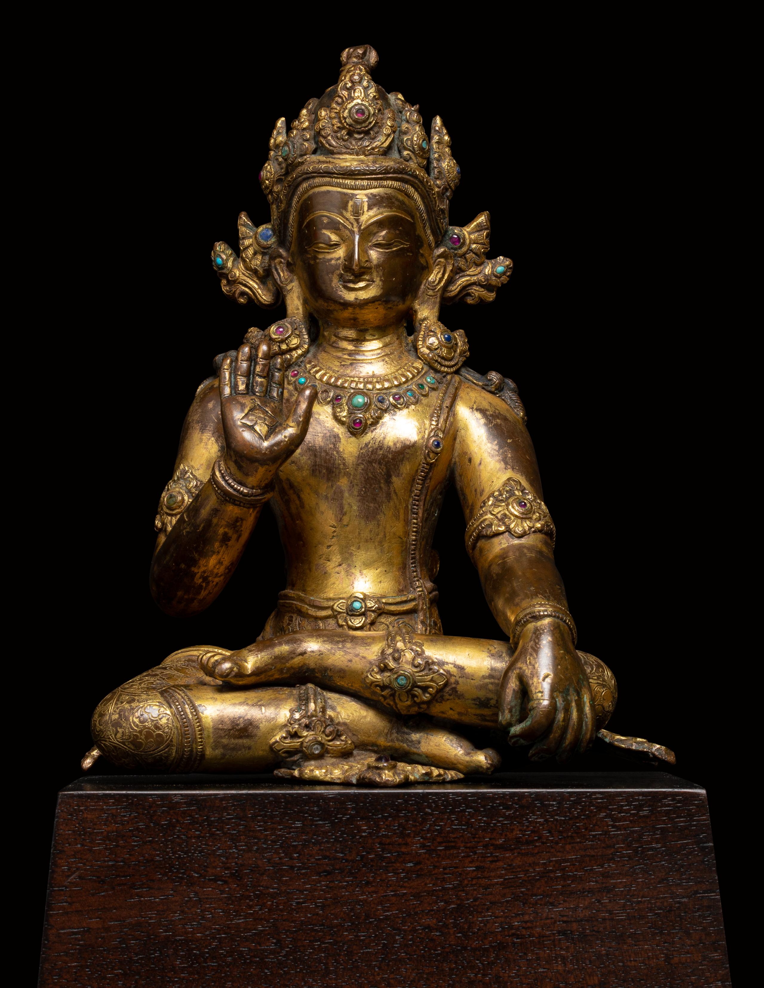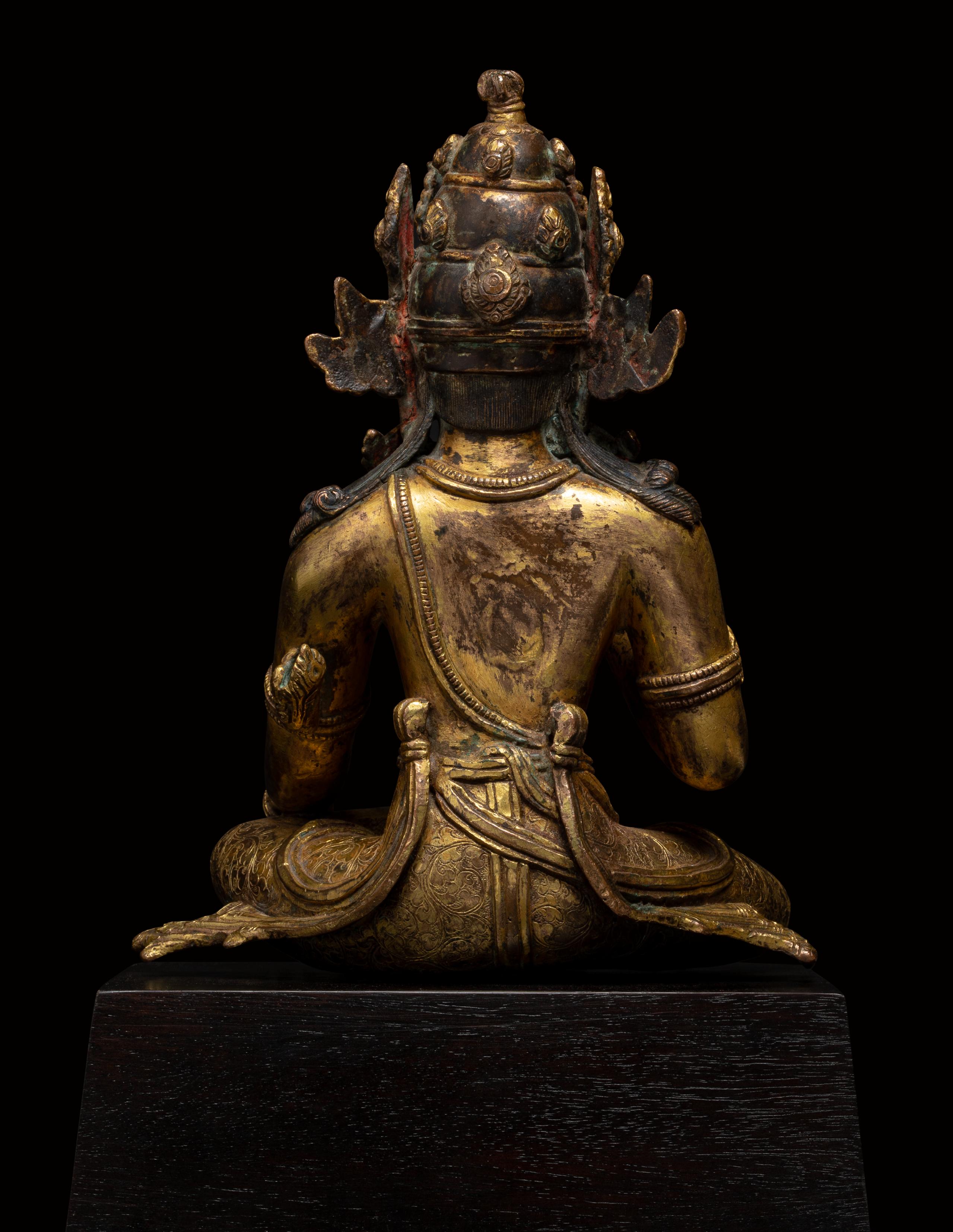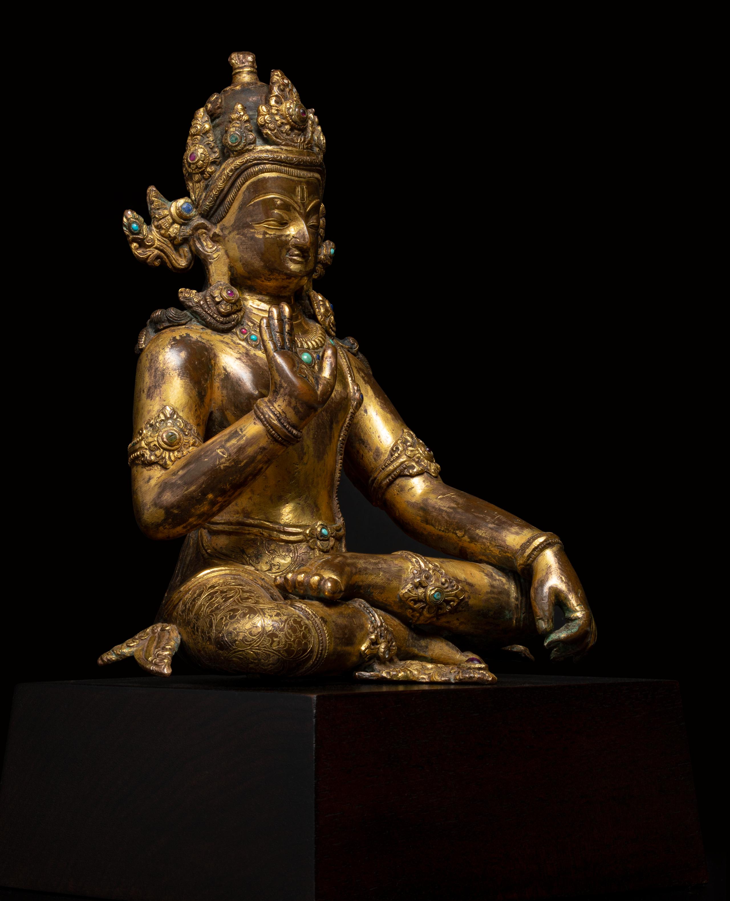 The elaborate five-petaled diadem and tiered helmet with a vajra finial are immediately telling of this fine bronze’s Nepalese origin. The style is common to Nepalese sculptures and mirrors that worn by Vajrayana Buddhist acharyas or priests in the Kathmandu Valley. The inlaying of translucent semi-precious stones beside the turquoise and lapis, which give color to the bodhisattva’s heavenly jewels, is also much more common in Nepal than Tibet. This finely cast, richly-gilded bodhisattva clearly displays the naturalistic physiognomy, typical aquiline nose, and precise decoration mastered by the Newar artists of the Kathmandu Valley during the early Malla period. A fifteenth-century figure of Manjushri or Maitreya at the Rubin Museum of Art provides a close comparison (Acc. C2003.33.2; see Himalayan Art Resources, item no. 65255). This figure, too, is clearly missing an iconographic element that would have emerged from a lotus stalk attached to the back of the proper-left arm. Also see a comparable sculpture, identified as Amoghasiddhi, sold at Christe’s New York (19 March 2013, lot 404). It is quite possible that these figures were part of the same set of sculptures depicting the Eight Great Bodhisattvas.