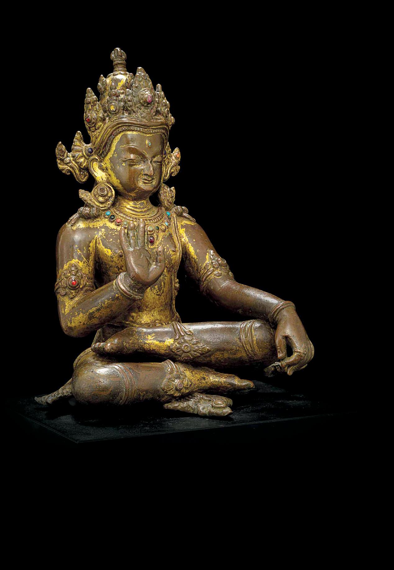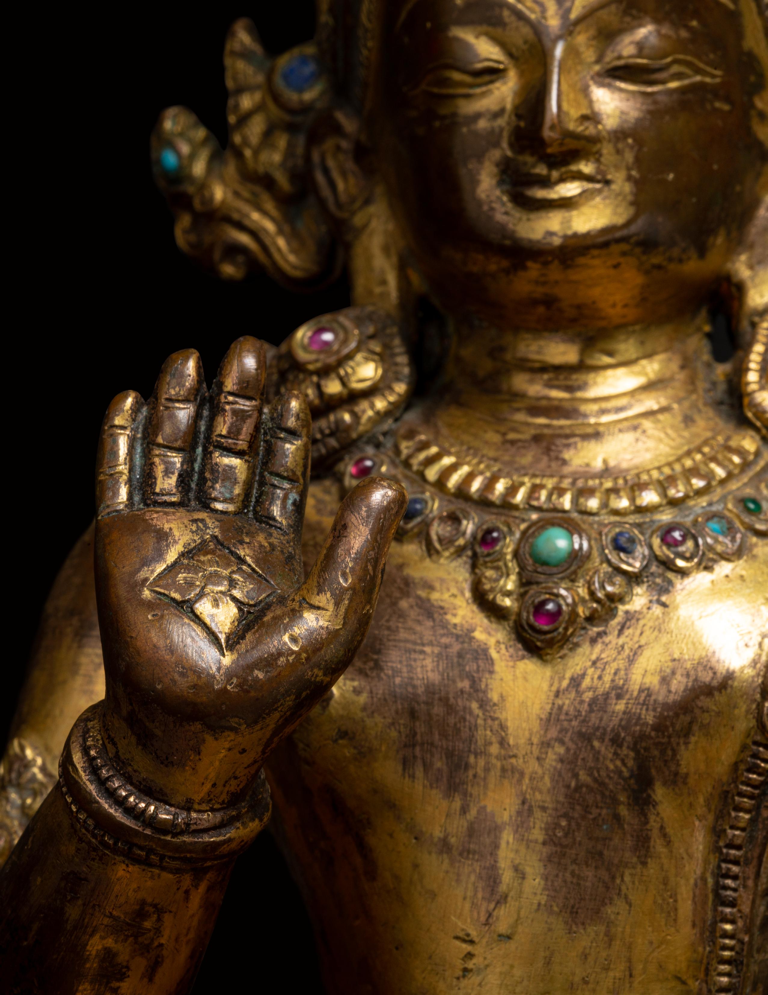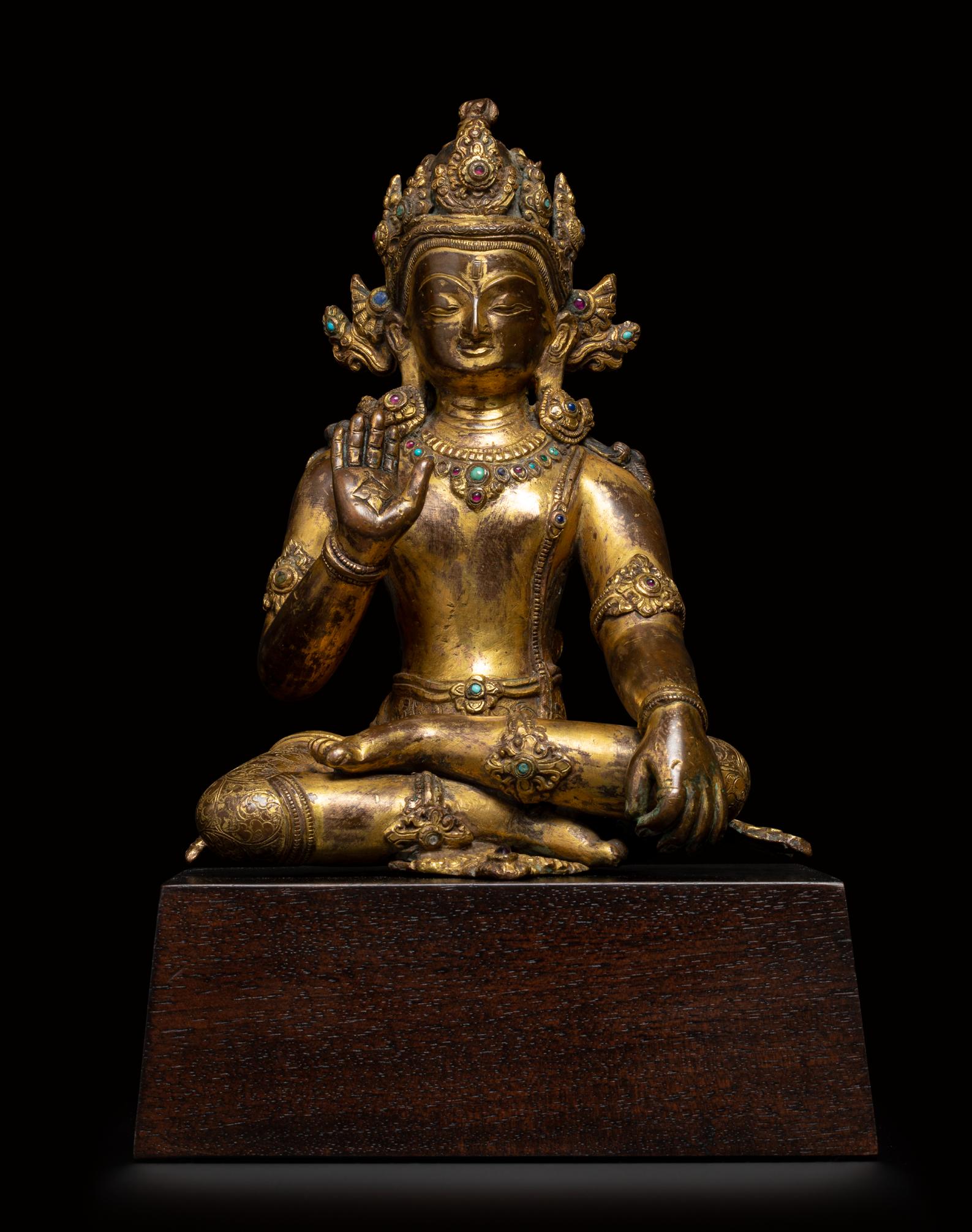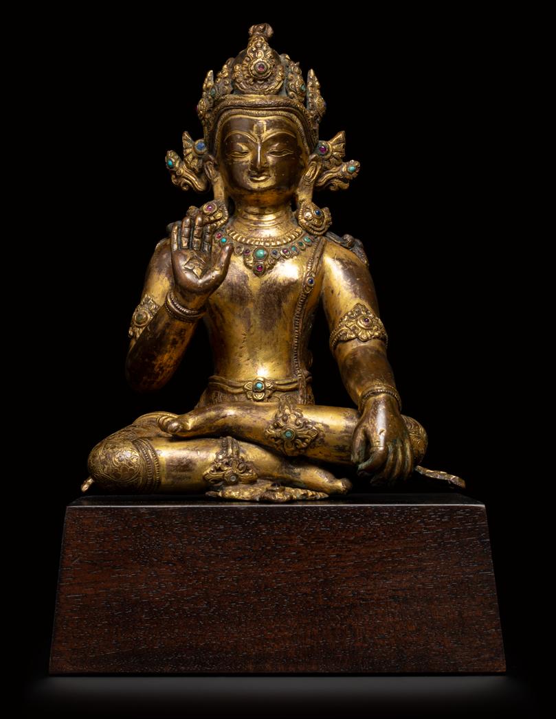 The elaborate five-petaled diadem and tiered helmet with a vajra finial are immediately telling of this fine bronze’s Nepalese origin. The style is common to Nepalese sculptures and mirrors that worn by Vajrayana Buddhist acharyas or priests in the Kathmandu Valley. The inlaying of translucent semi-precious stones beside the turquoise and lapis, which give color to the bodhisattva’s heavenly jewels, is also much more common in Nepal than Tibet. This finely cast, richly-gilded bodhisattva clearly displays the naturalistic physiognomy, typical aquiline nose, and precise decoration mastered by the Newar artists of the Kathmandu Valley during the early Malla period. A fifteenth-century figure of Manjushri or Maitreya at the Rubin Museum of Art provides a close comparison (Acc. C2003.33.2; see Himalayan Art Resources, item no. 65255). This figure, too, is clearly missing an iconographic element that would have emerged from a lotus stalk attached to the back of the proper-left arm. Also see a comparable sculpture, identified as Amoghasiddhi, sold at Christe’s New York (19 March 2013, lot 404). It is quite possible that these figures were part of the same set of sculptures depicting the Eight Great Bodhisattvas.
