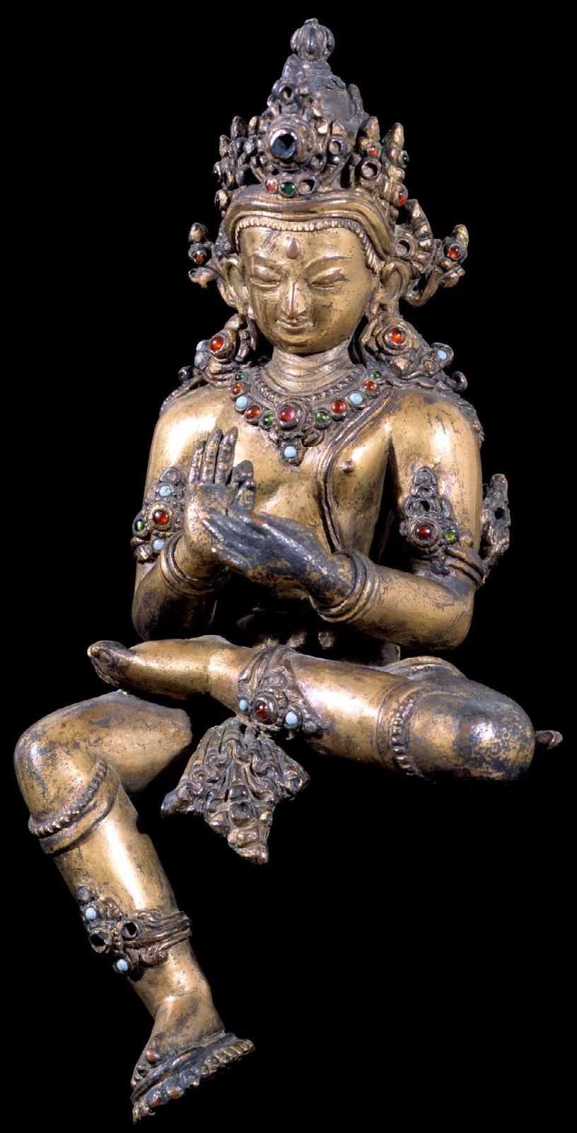 Downcast eyes and slightly upturned lips convey the spiritual equipoise of this benevolent buddhist being. The figure wears all of the garments of a bodhisattva: a crown, necklaces, bracelets, a sacred cord, a festooned belt around a floral dhoti, and anklets. This heavenly manifestation is known as a sambhogakaya (Skt.) appearance. In English, this Tantric Buddhist class of beings are referred to as ‘enjoyment bodies.’ The sambhogakaya is a realm one gains access to through the highest dimensions of practice; it is where all bodhisattvas reside. Sambhogakaya manifestations are considered one of the primary means through which buddhist truths are made manifest to human beings. Buddhas often take on this appearance to teach highly realized practitioners and bodhisattvas.