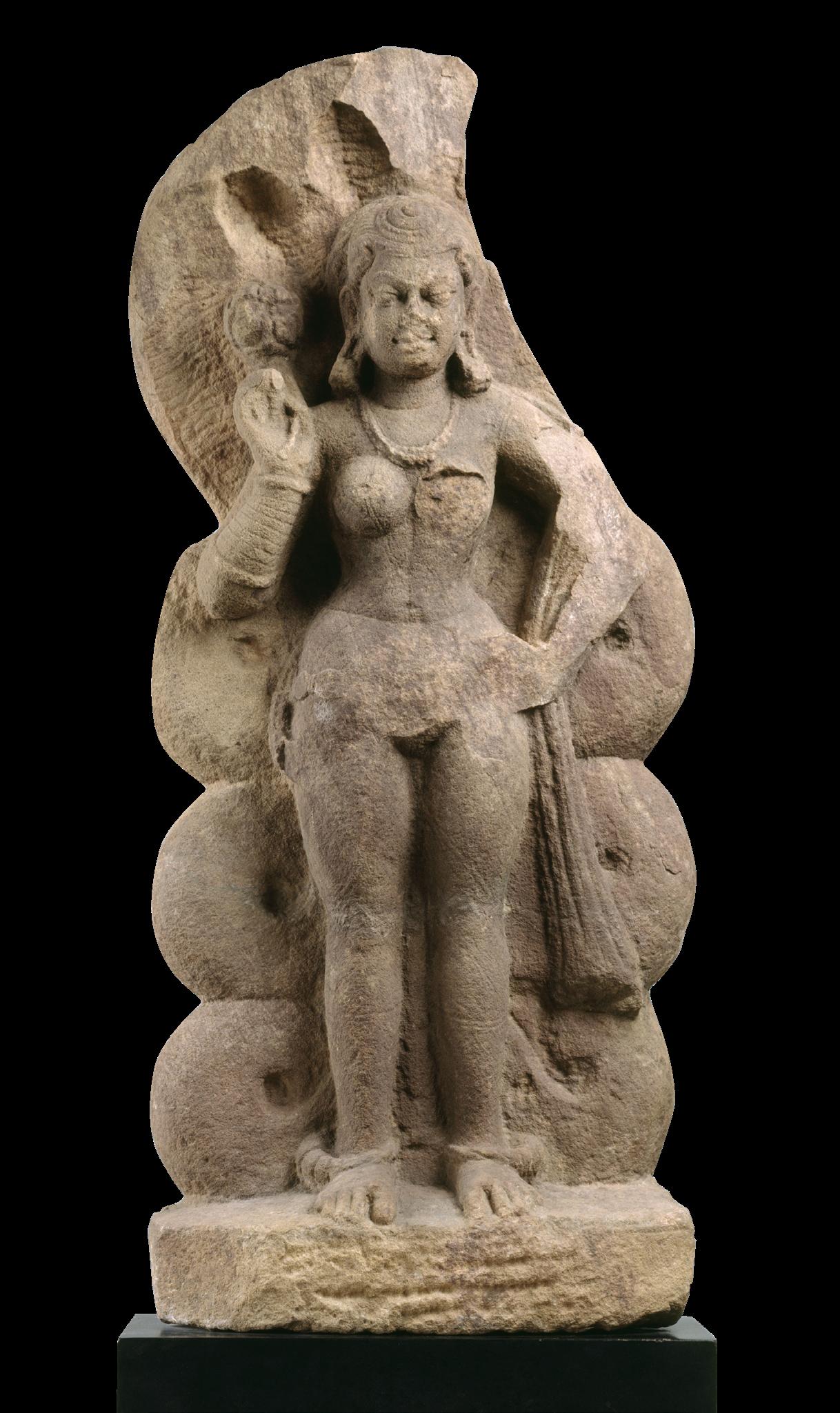 Compare the present relief to a nagini dated to the second quarter of the fifth century at the Metropolitain Museum of Art. While her hips are more exaggerated (indicative of the slightly earlier date and persisting Kushan influence) the figure is, otherwise, strikingly similar–especially in terms of facial features and ornamentation. This figure, too, would have had a male counterpart.