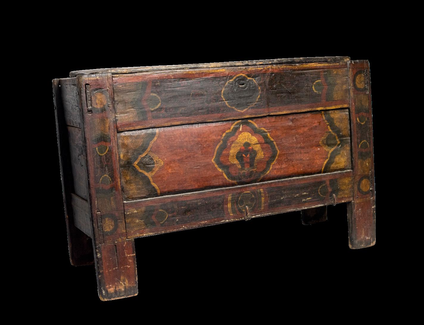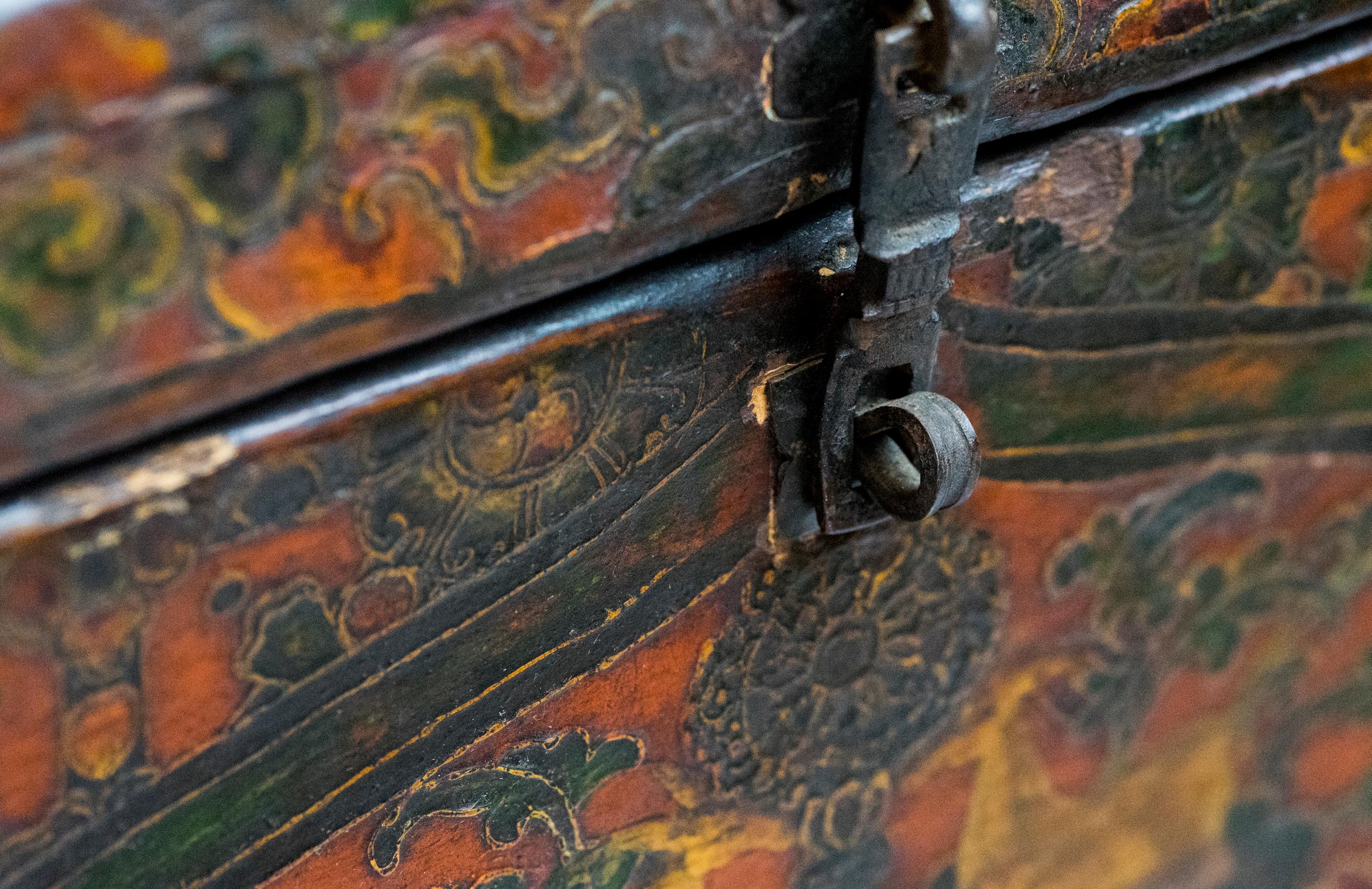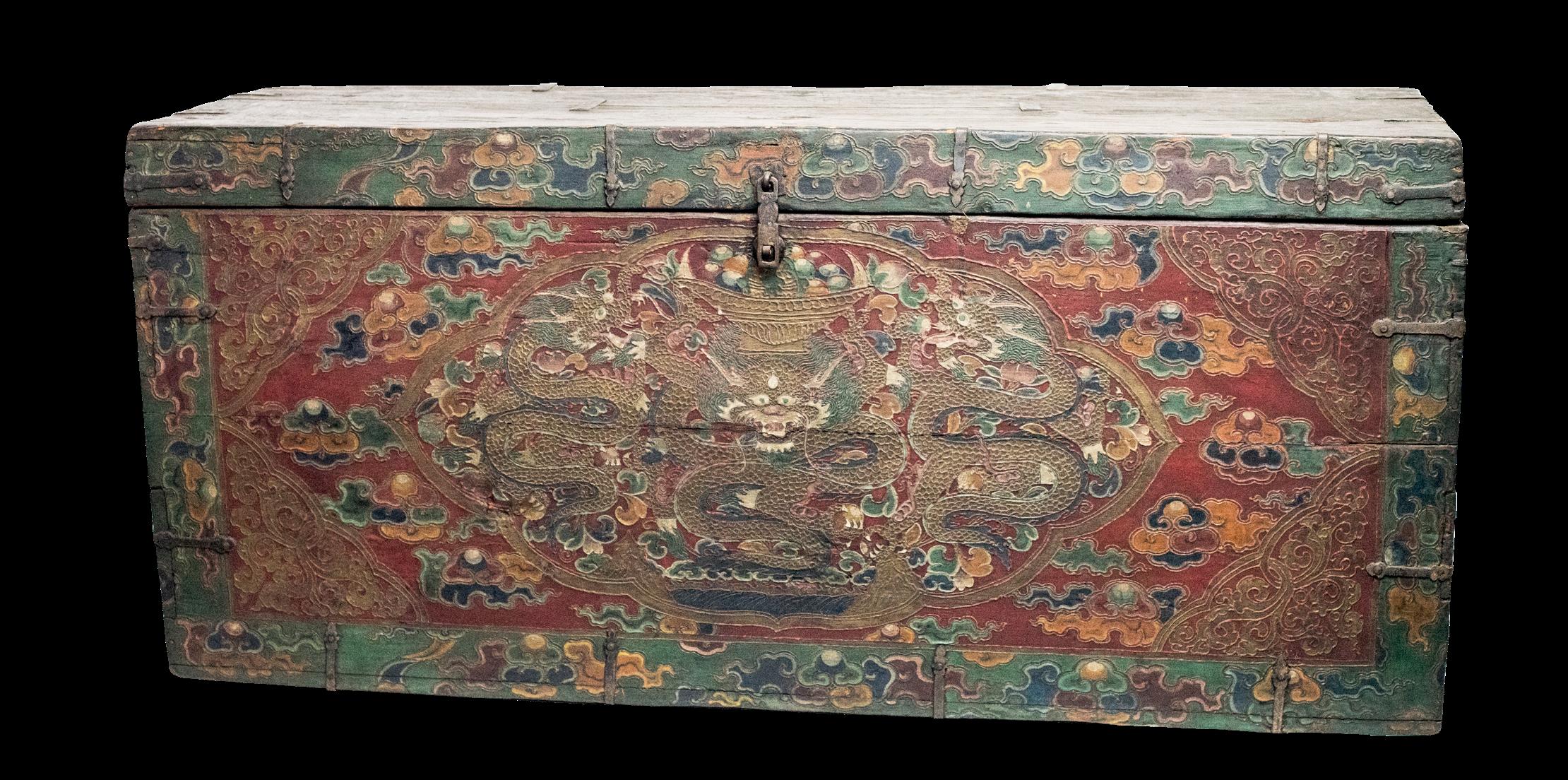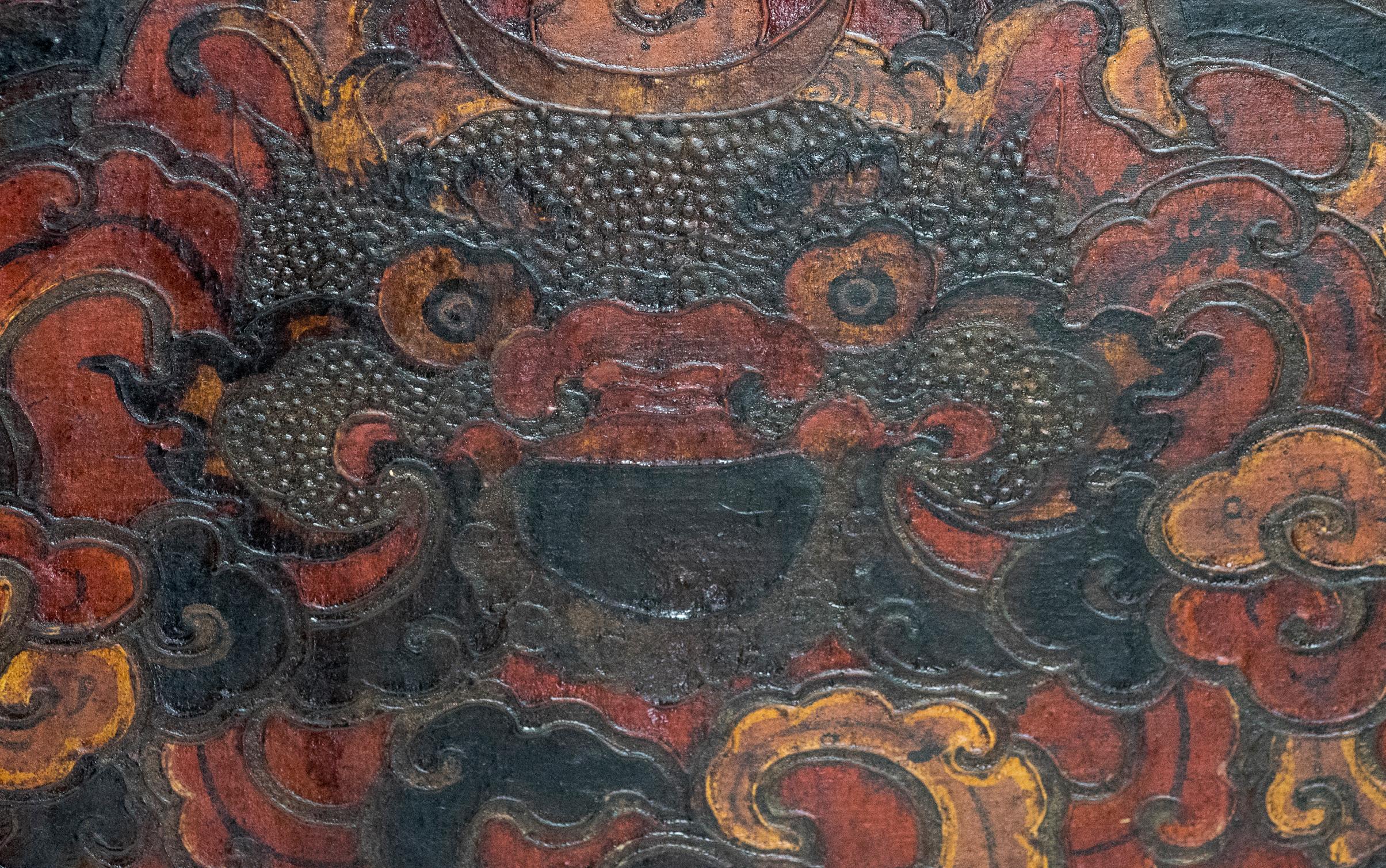The present chest was likely used by a wealthy Tibetan to store their personal belongings. Non-religious symbols like the dragon were popular among lay people, as they were believed to reinforce auspicious outcomes like a long and prosperous life.
