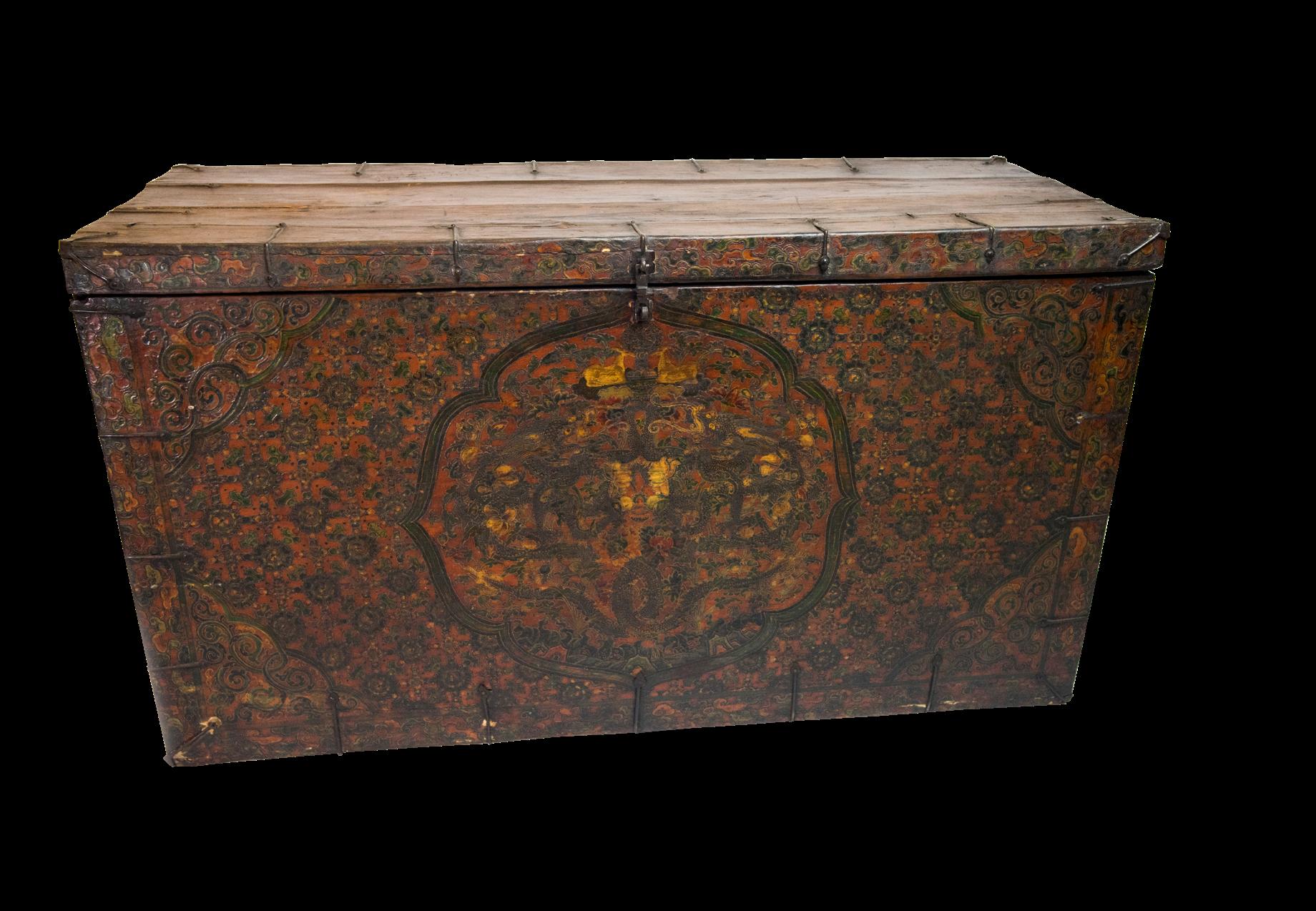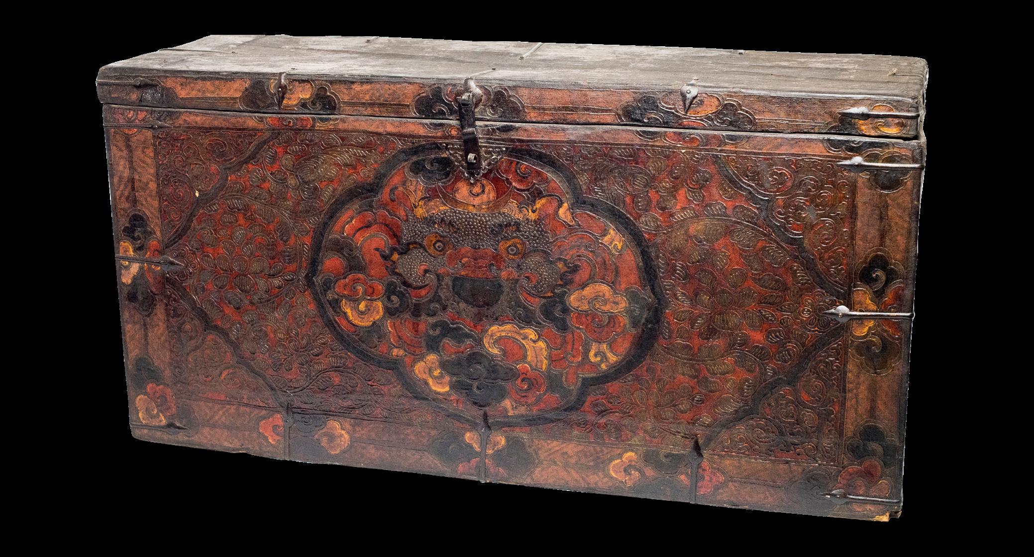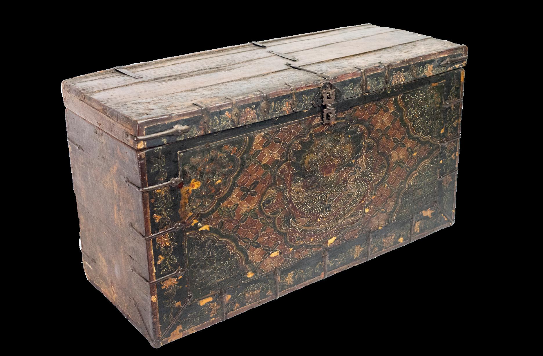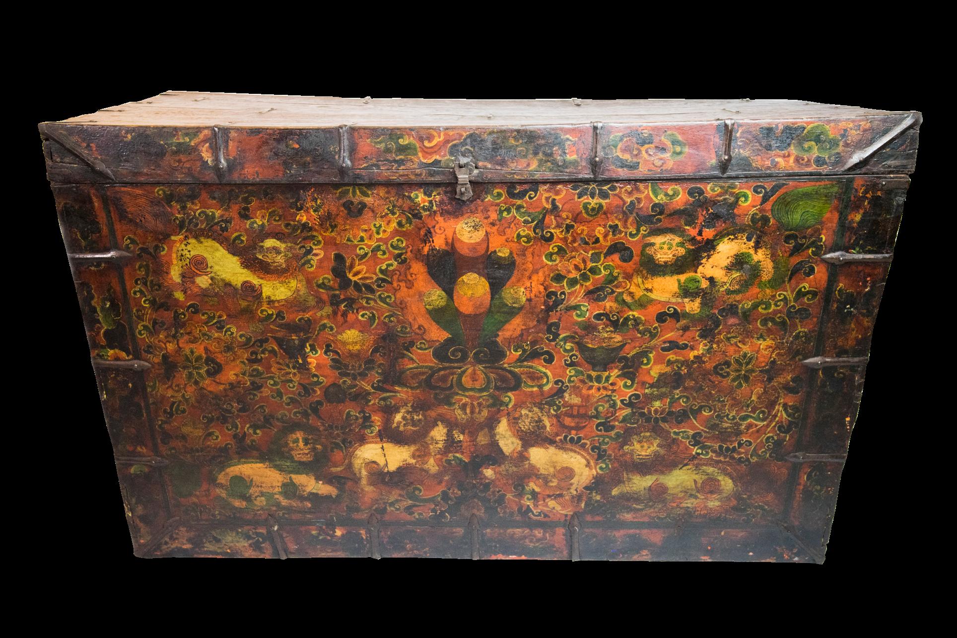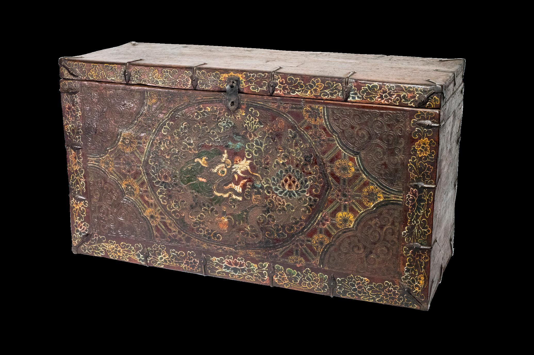 Many of these Tibetan trunks are built with metal braces and a centrally located lock plate, with the intent of being portable. Beyond their utility, however, these trunks are works of art. Each of these Tibetan motifs takes inspiration from the surrounding Himalayan cultures and from Chinese aesthetics.