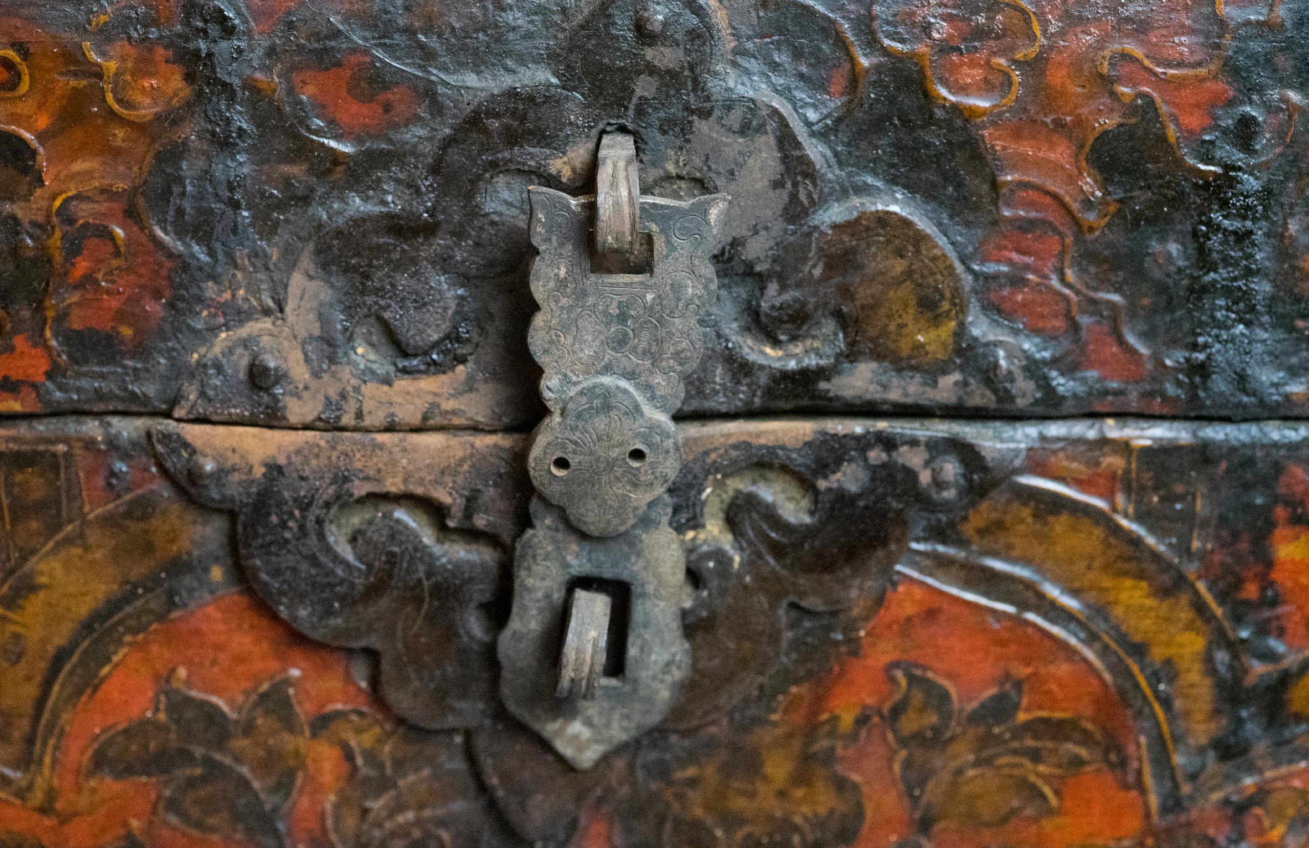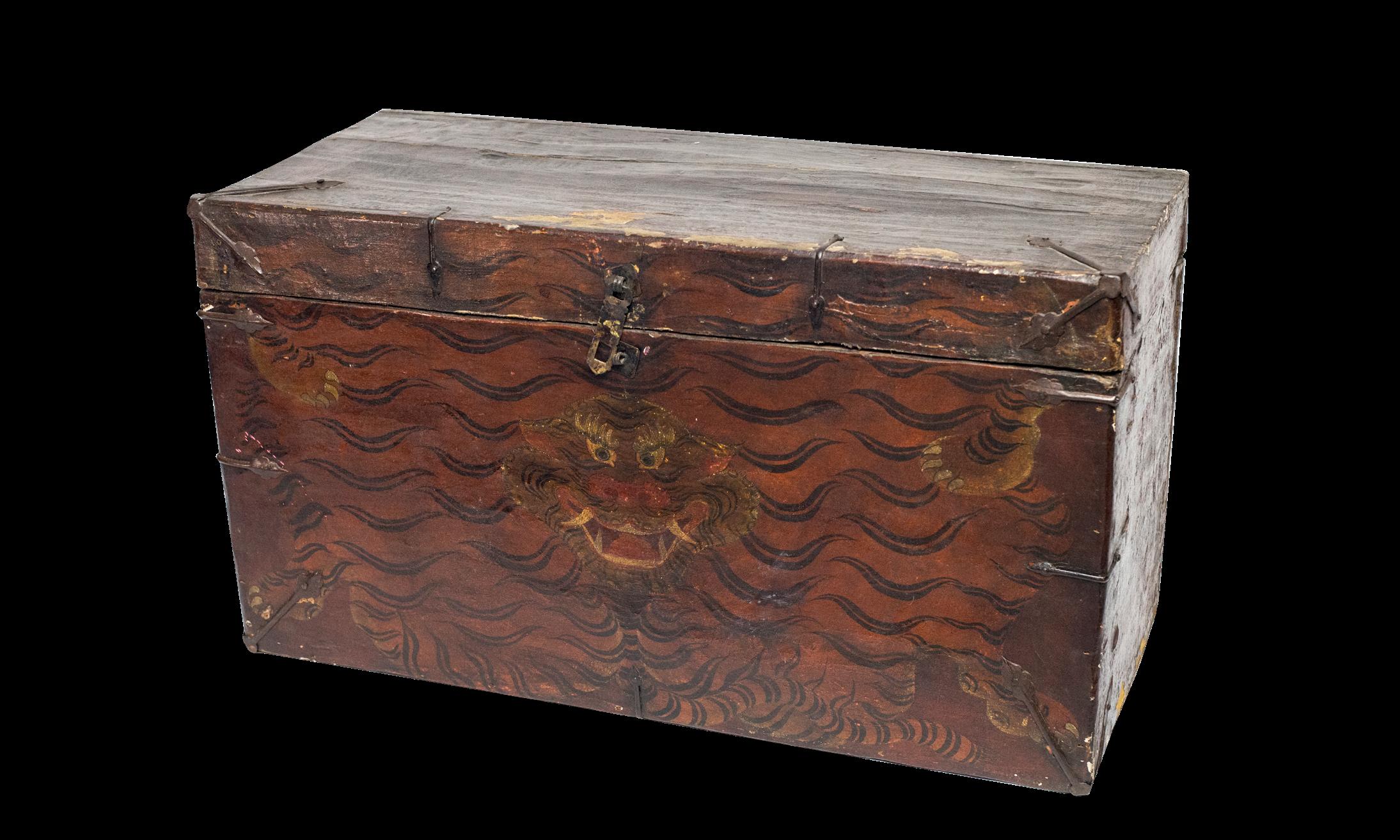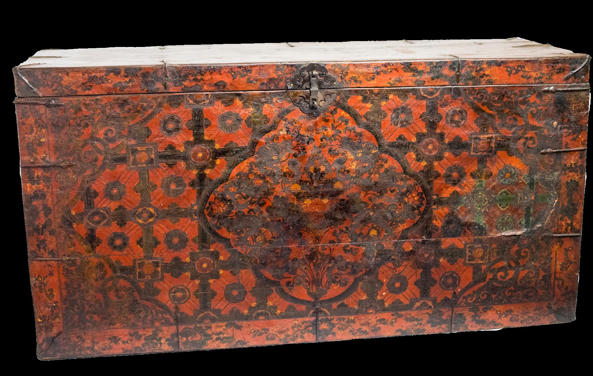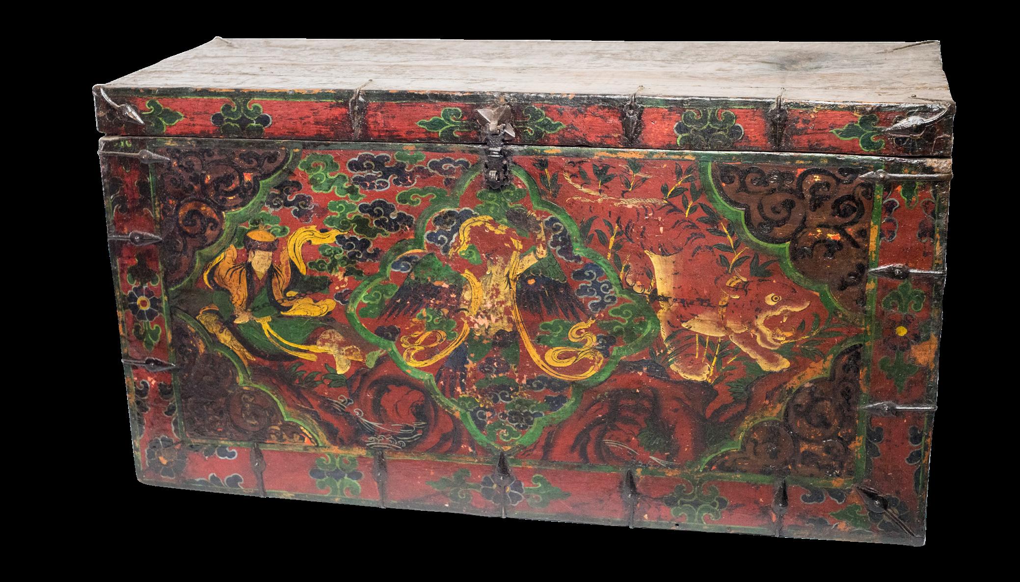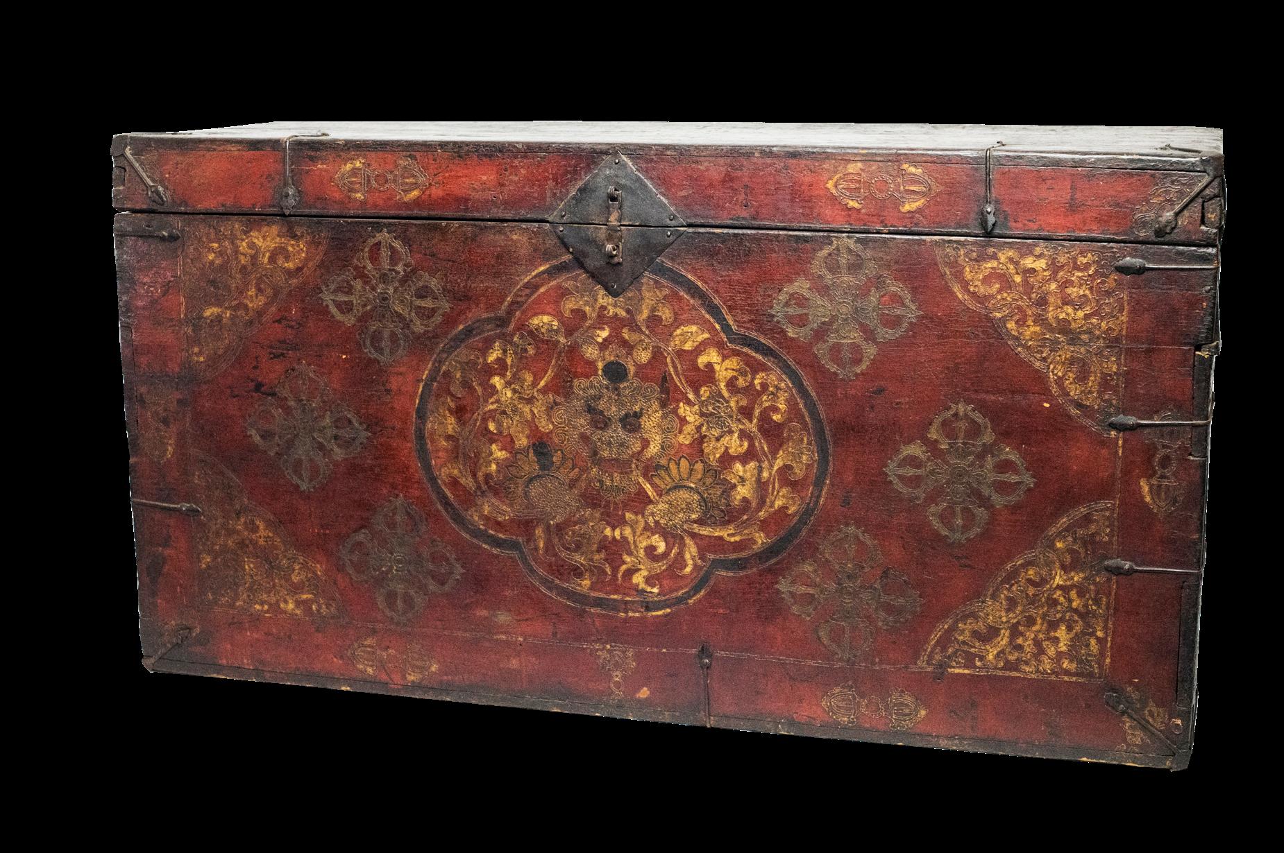 Many of these Tibetan trunks are built with metal braces and a centrally located lock plate, with the intent of being portable. Beyond their utility, however, these trunks are works of art. Each of these Tibetan motifs takes inspiration from the surrounding Himalayan cultures and from Chinese aesthetics.
