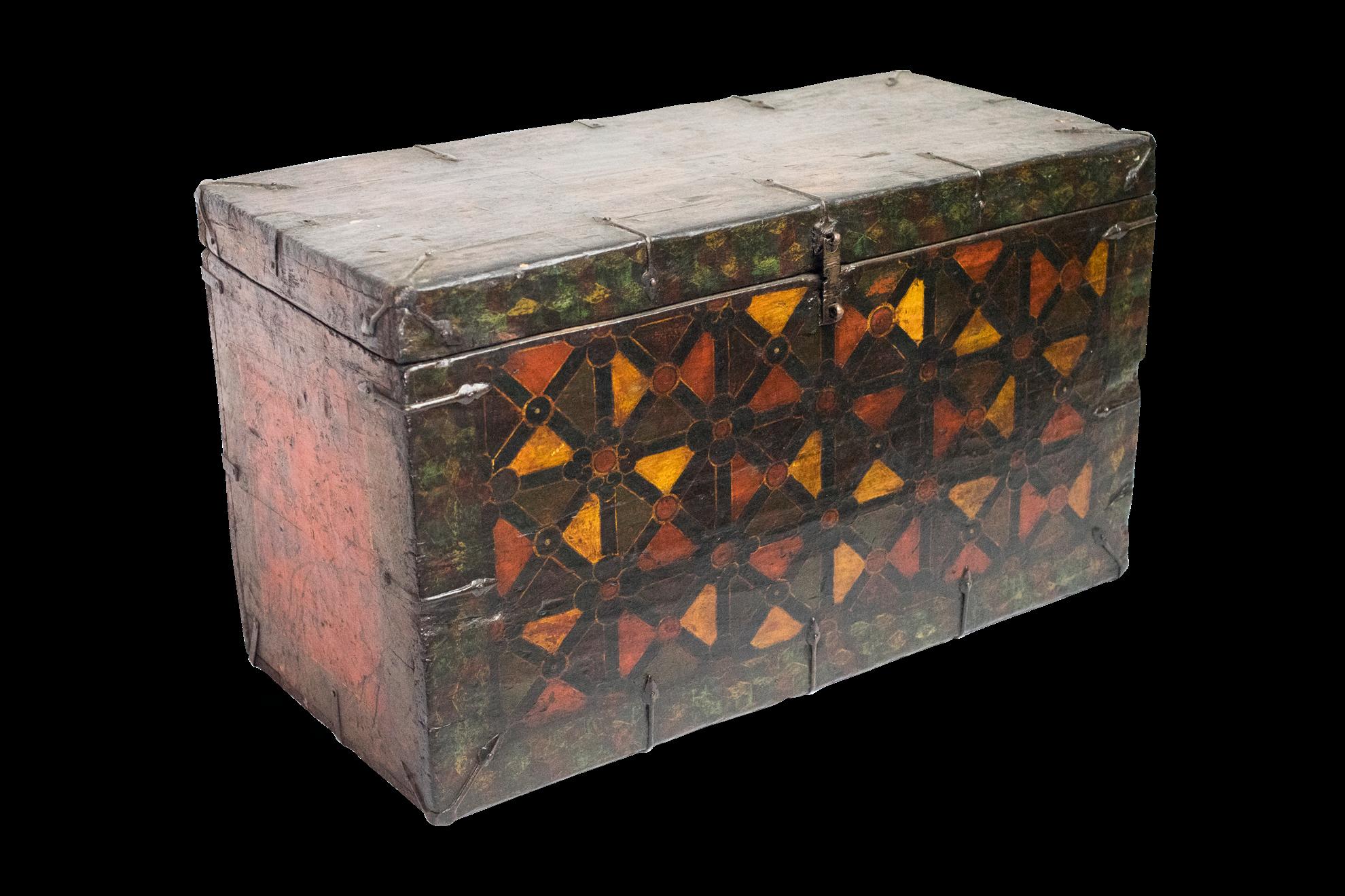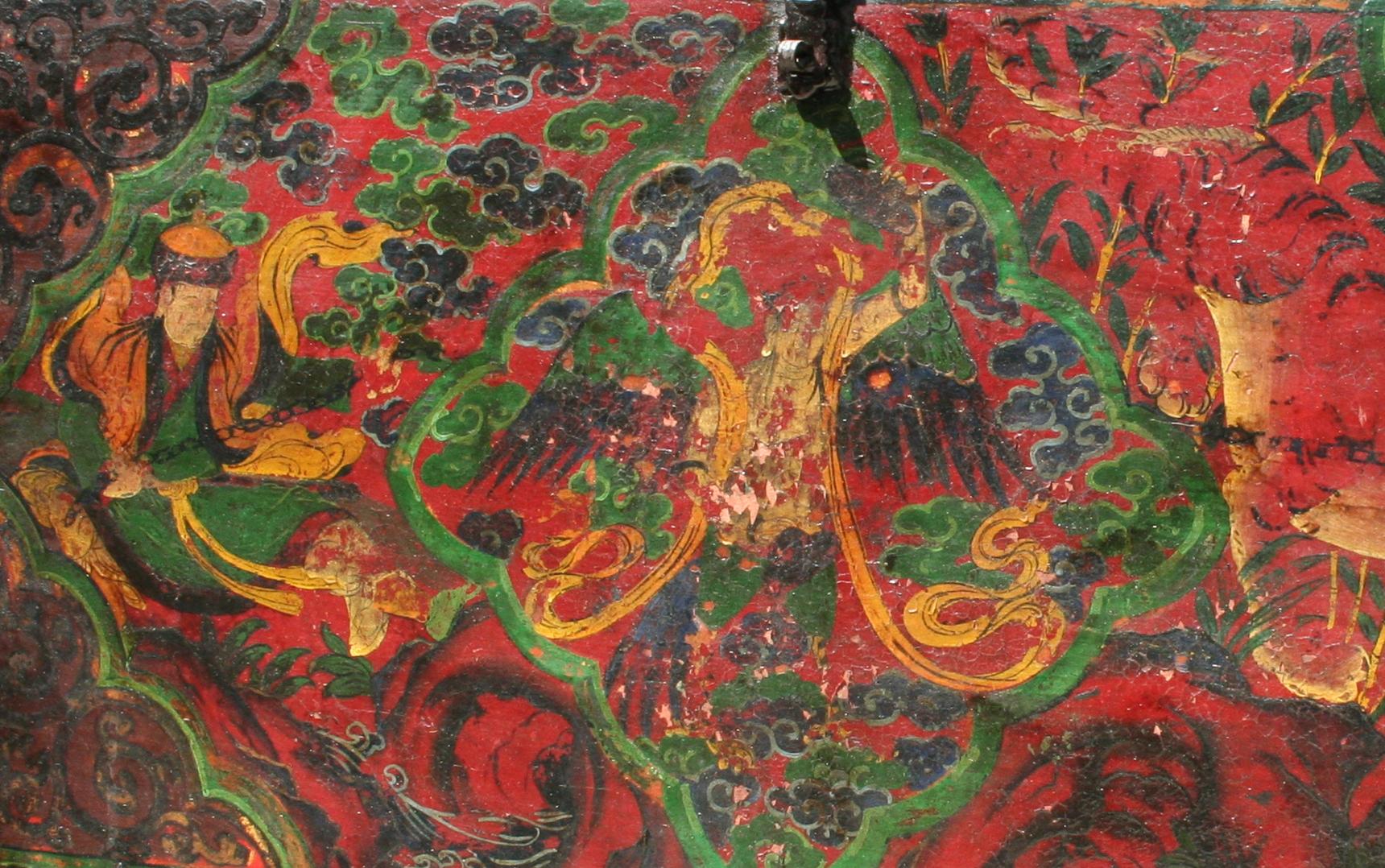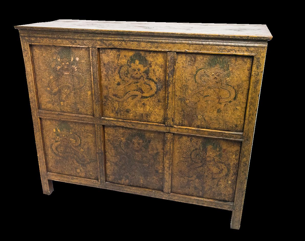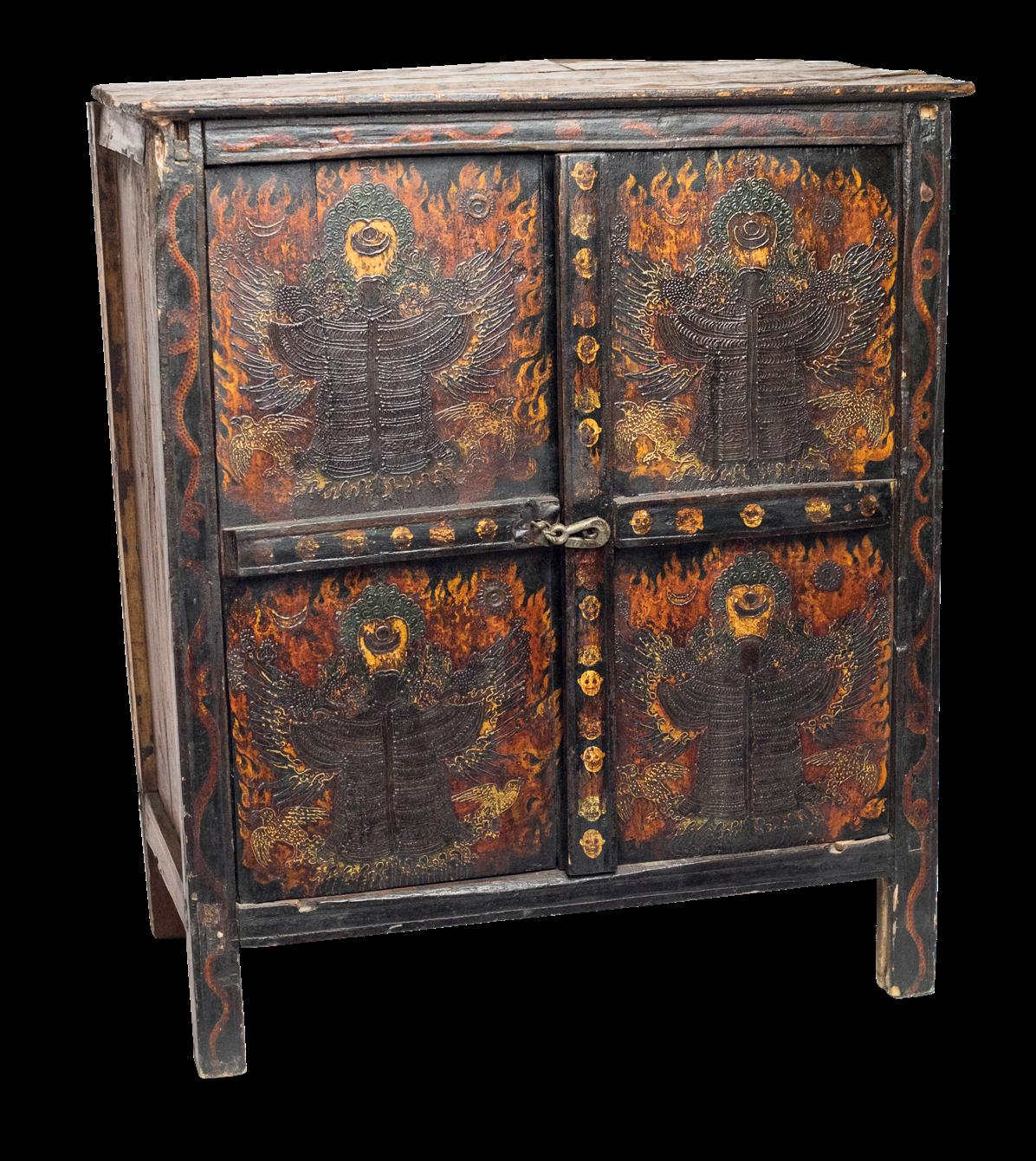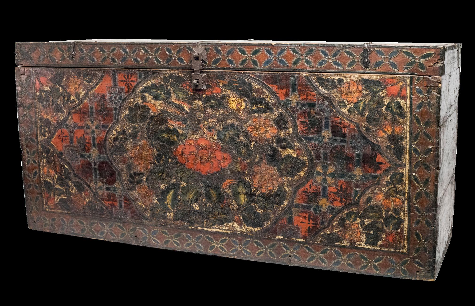 Many of these Tibetan trunks are built with metal braces and a centrally located lock plate, with the intent of being portable. Beyond their utility, however, these trunks are works of art. Each of these Tibetan motifs takes inspiration from the surrounding Himalayan cultures and from Chinese aesthetics.