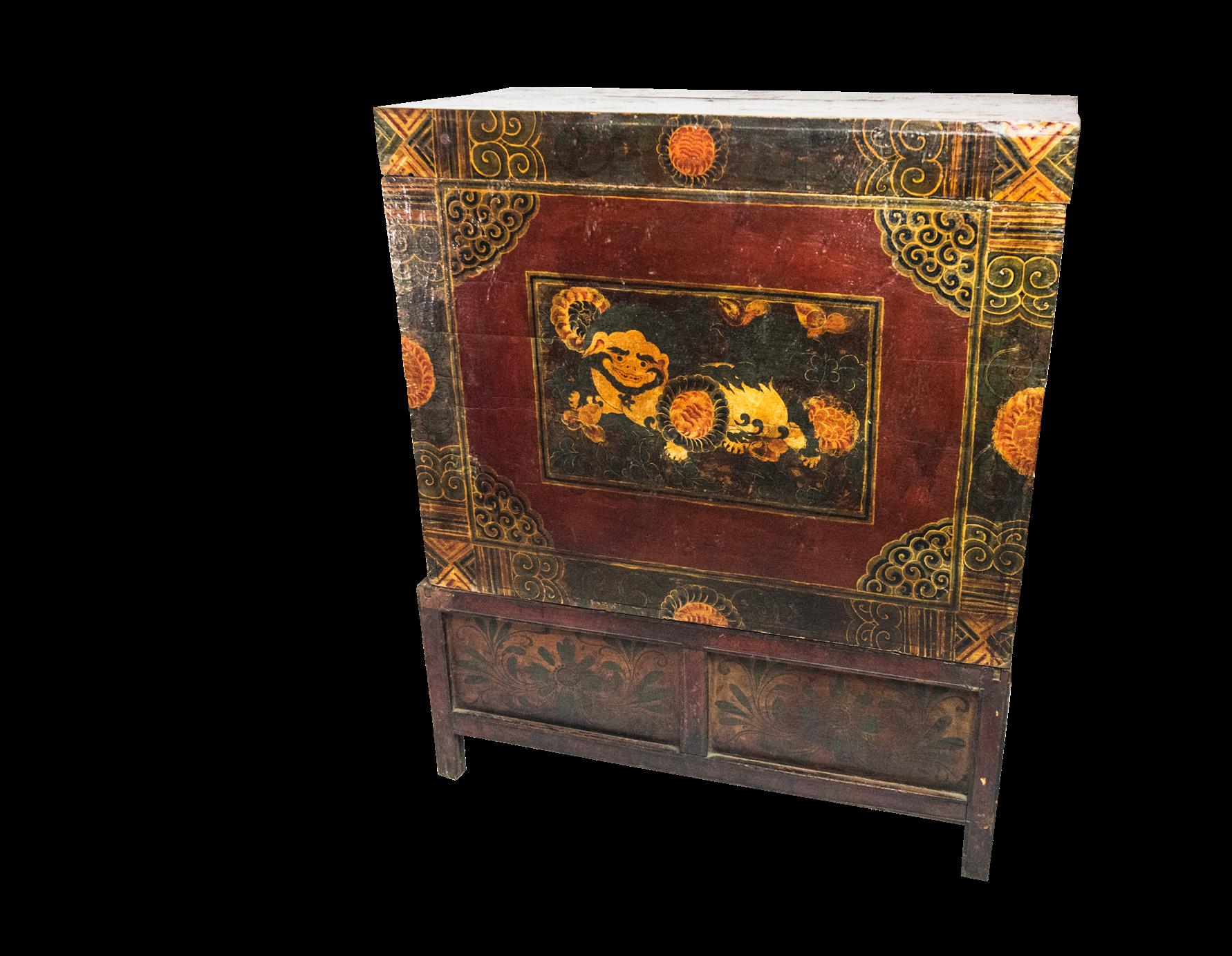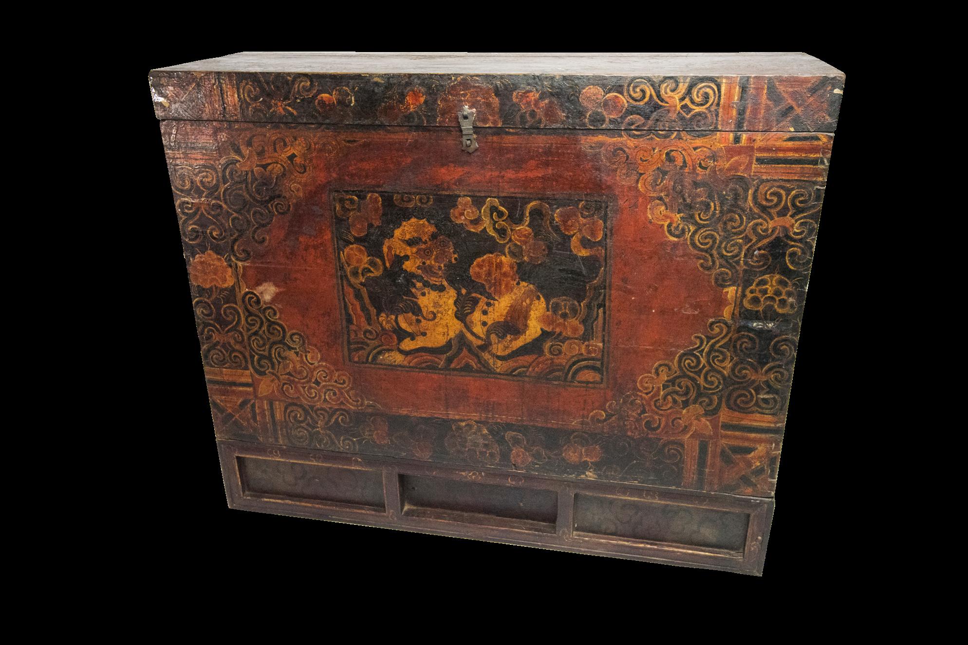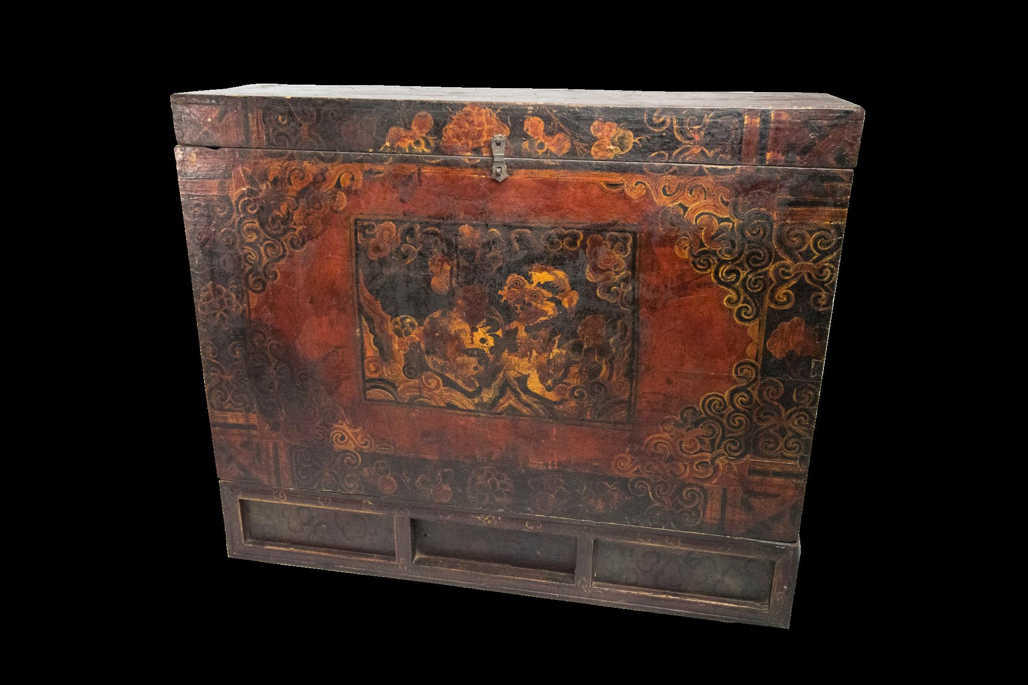 Chest Painted with a Playful Snow Lion, Clouds, with Geometric Motifs