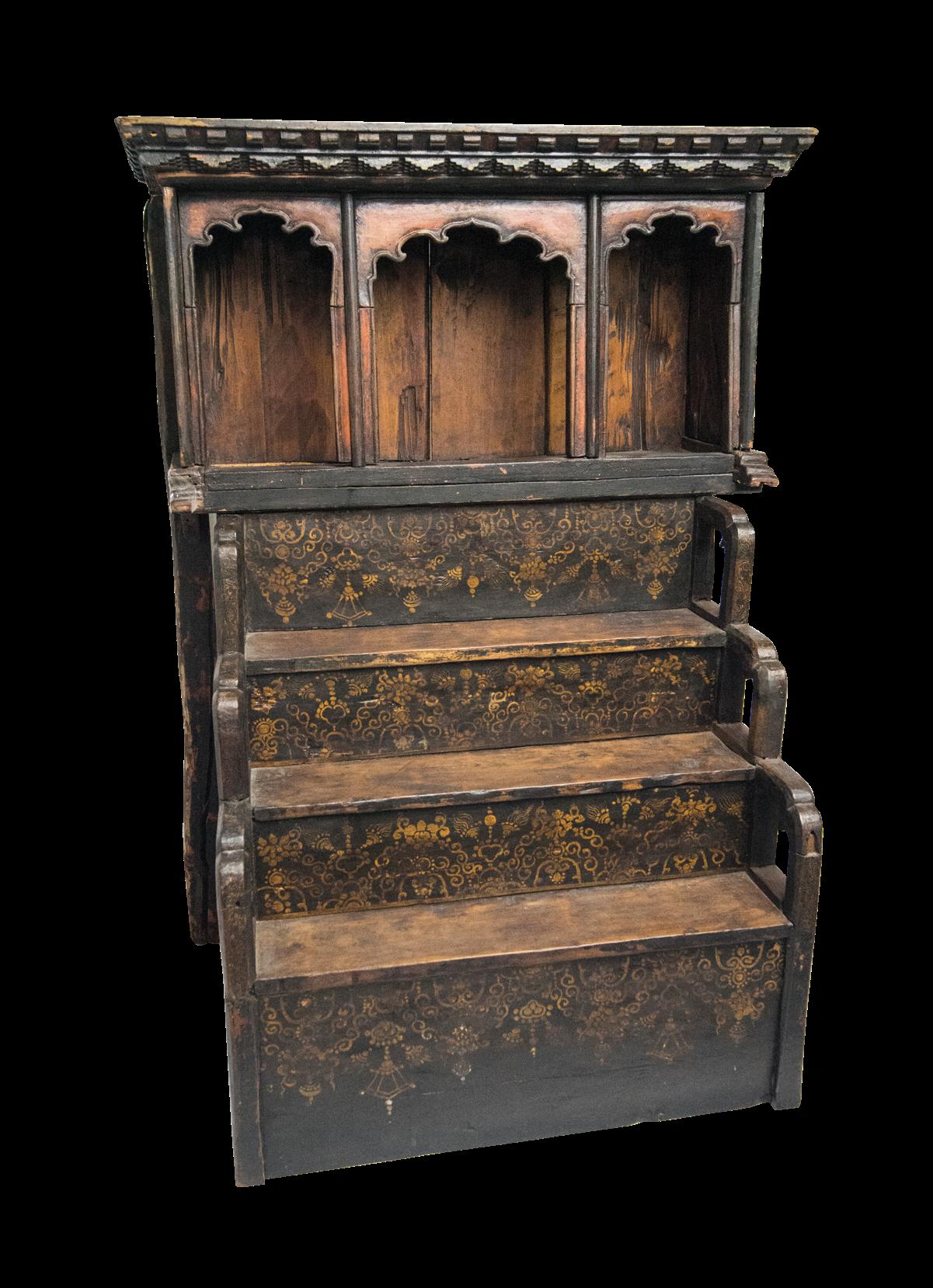 This piece of furniture is a shrine upon which small figures of buddhas, bodhisattvas and other tantric deities are placed in the windowed alcoves and atop the stepped shelves, along with other ritual objects. It is typical for Tibetans to place bowls of water, rice, or sweets thereon as offerings to the chosen deities. Jewel-like decorations and auspicious symbols are painted in gold on each step of this fine chösham.