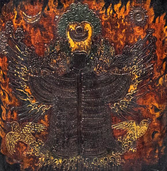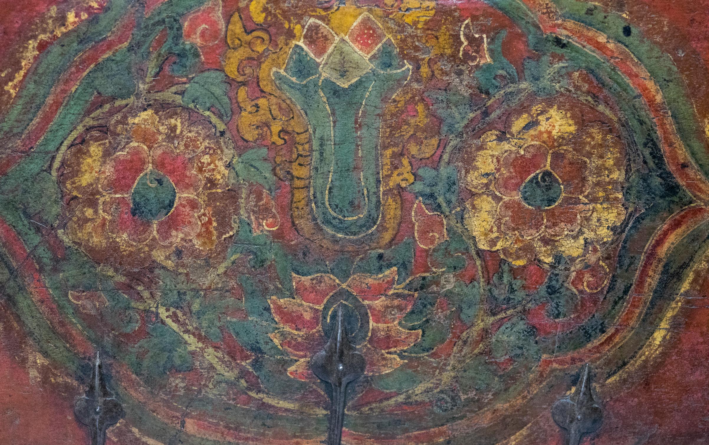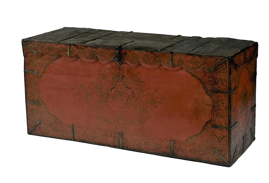 The present chest is decorated with the attributes of a wrathful Tibetan deity known as a heruka (Tib. drag-thung) or ‘blood-drinker’. A chest like this may have been kept in a protector temple, where wrathful deities are propitiated.