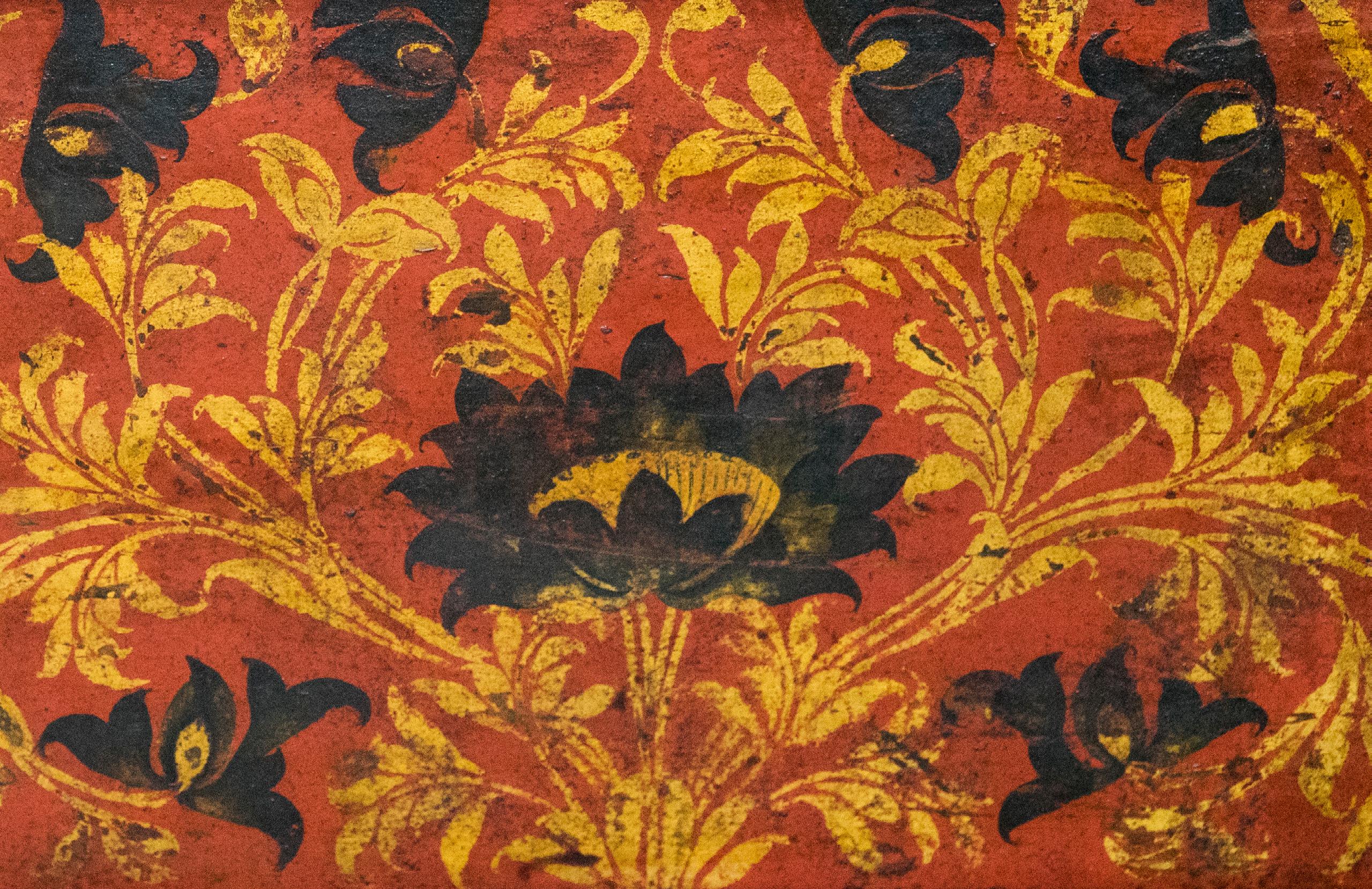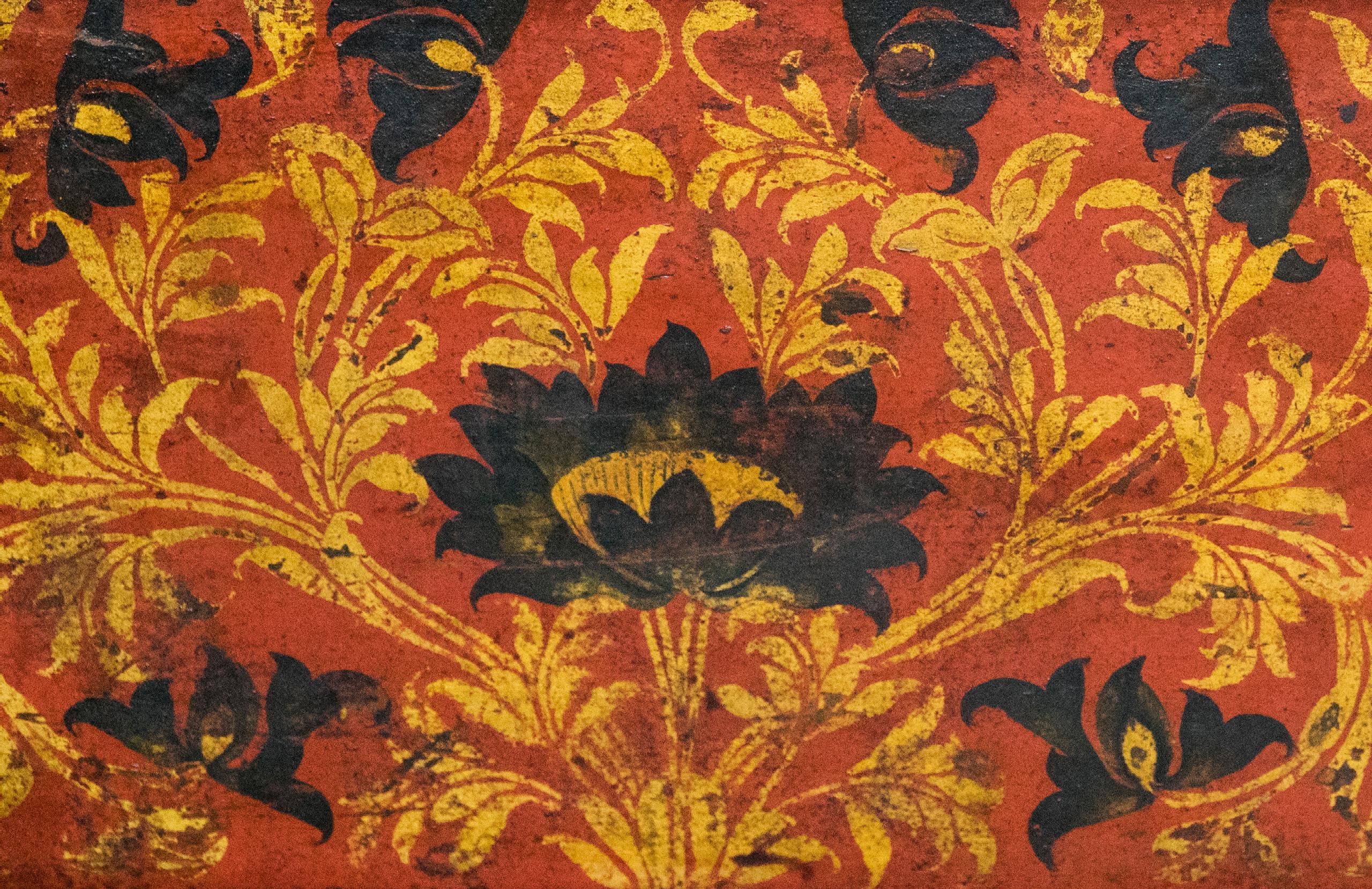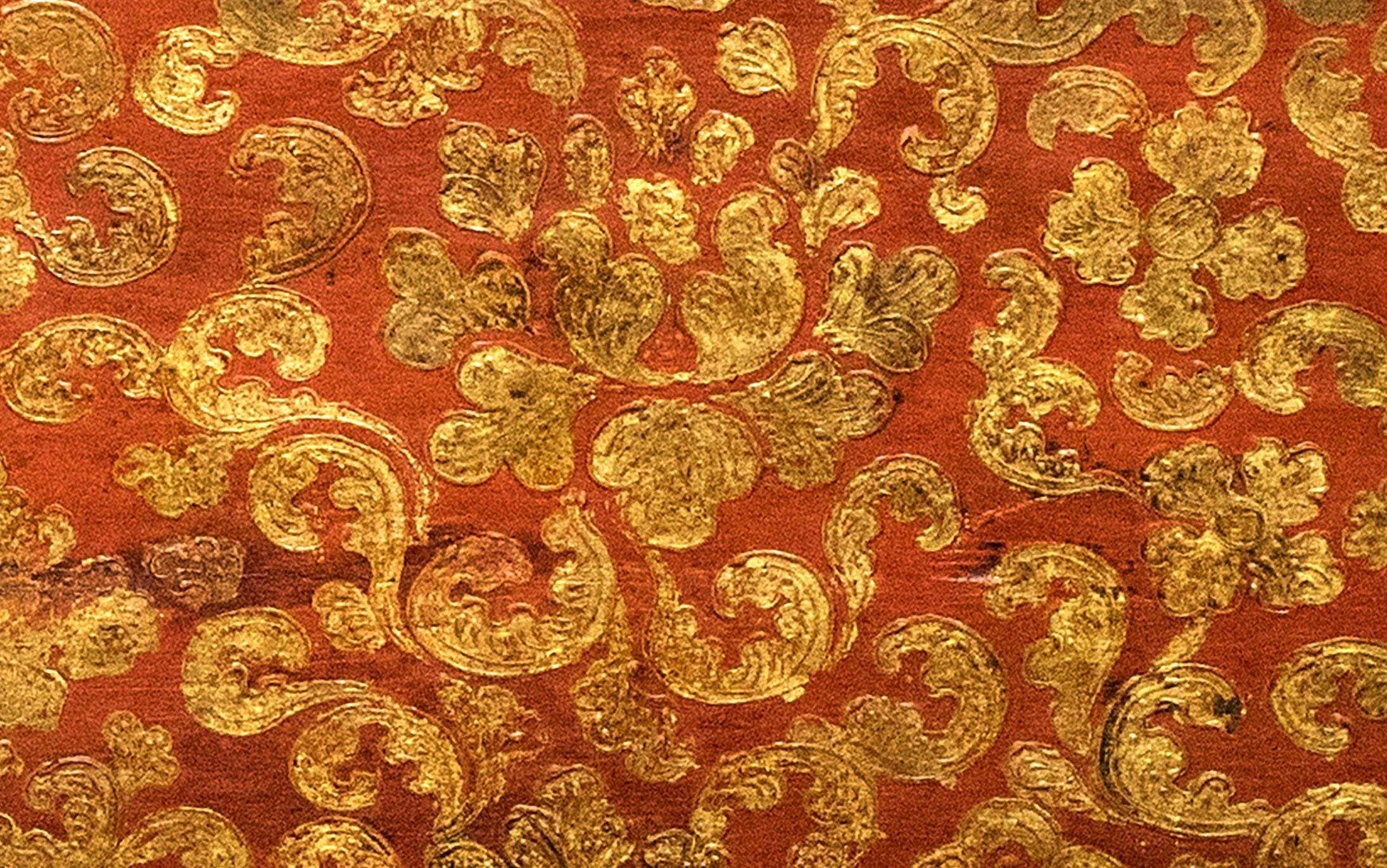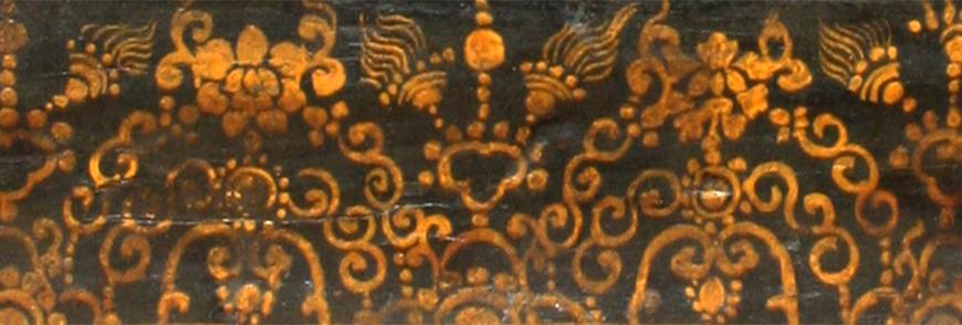 The present chest, like the previous chest, was likely used by a wealthy Tibetan to store their personal belongings, as it is also devoid of overtly religious symbols. It is clear that this chest was once completely covered in gold embellishments. Many remnants of the elaborate gold patterns remain,as do carefully placed, carved flowers. A cloud design appears on the lowermost panel. Himalayan Art Resources, Item No. 55359