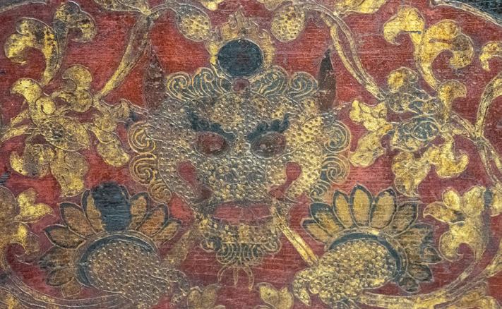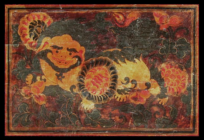 The mythical snow lion is the national symbol of Tibet, hence its incorporation into furniture decoration and artworks. The snow lion is said to be the protector of the Buddha, symbolizing fearlessness and clarity. Himalayan Art Resources, Item No. 55379