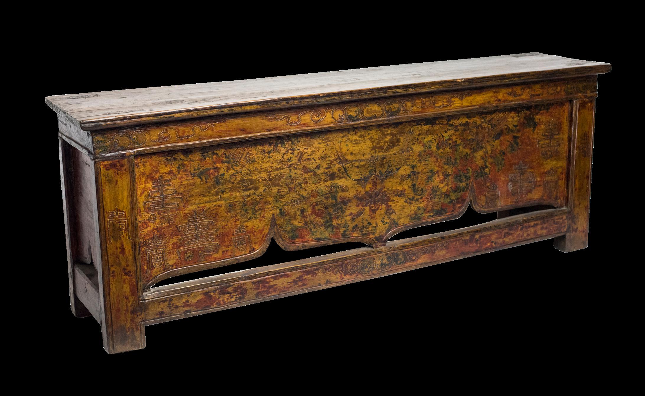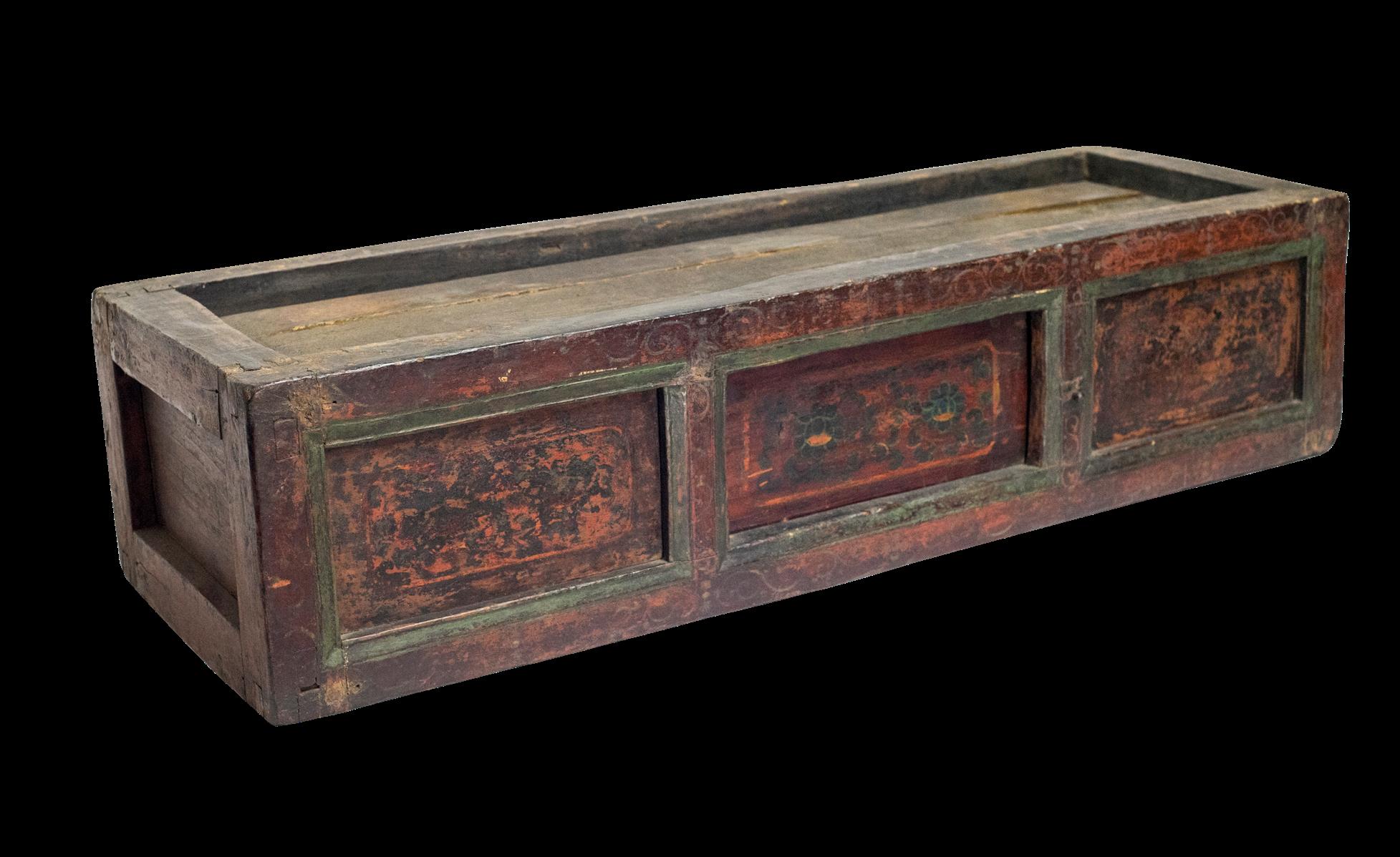 A low table such as the present example is utlized by monks and lamas to place ritual object or religious texts (pecha) during a puja or ritual.