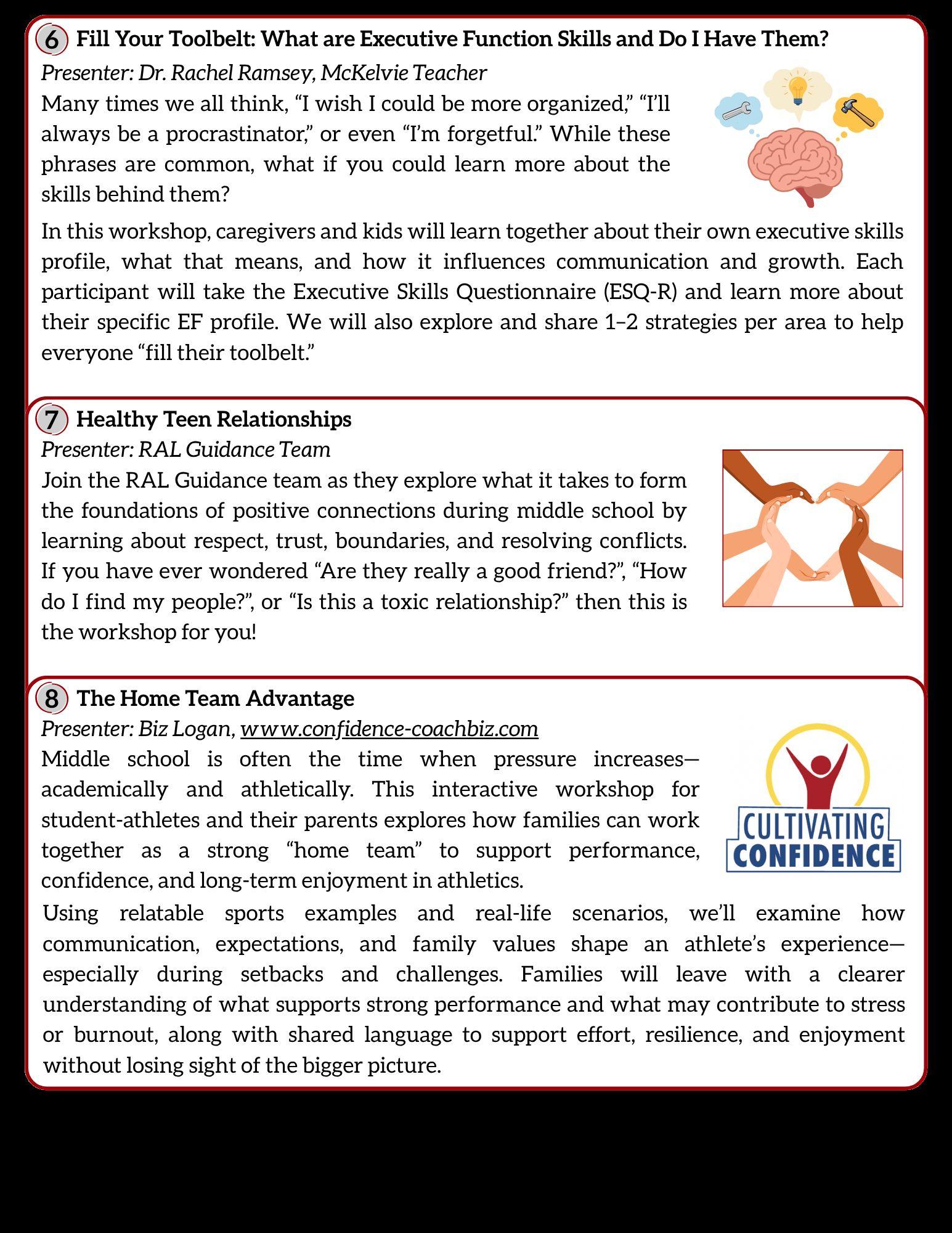Presenter: Biz Logan, Middle school is often the time when pressure increases-academically and athletically.Explorehowfamiliescanworktogetherasastrong"hometeam" to support performance, confidence, and long-term enjoyment in athletics. Families will leave with a clearer understanding of what supports strong performance and what may contribute to stress or burnout, along with shared language to support effort, resilience, and enjoyment without losing sightofthebiggerpicture.