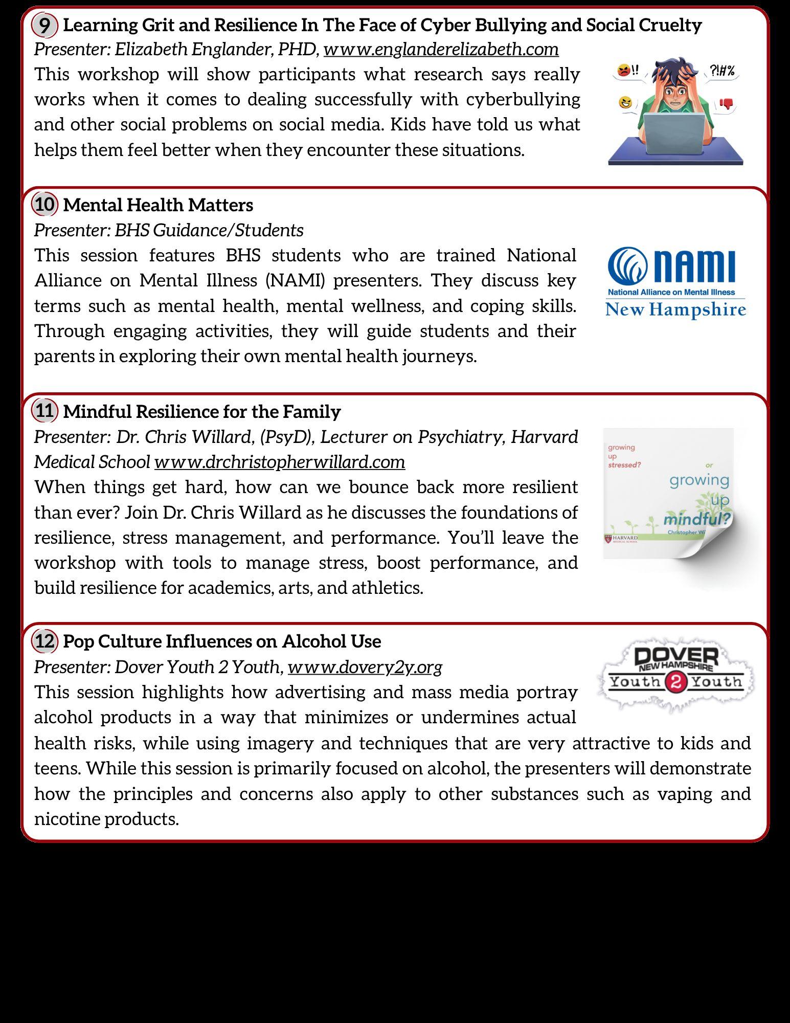 Students and parents/guardians register together for two workshop sessions. All participants will attend a common third workshop presented by the Browne Center. Speakers and workshop topics have been selected based on suggestions from previous attendees andaredesignedtohelpyounavigatetheroadaheadtogether.