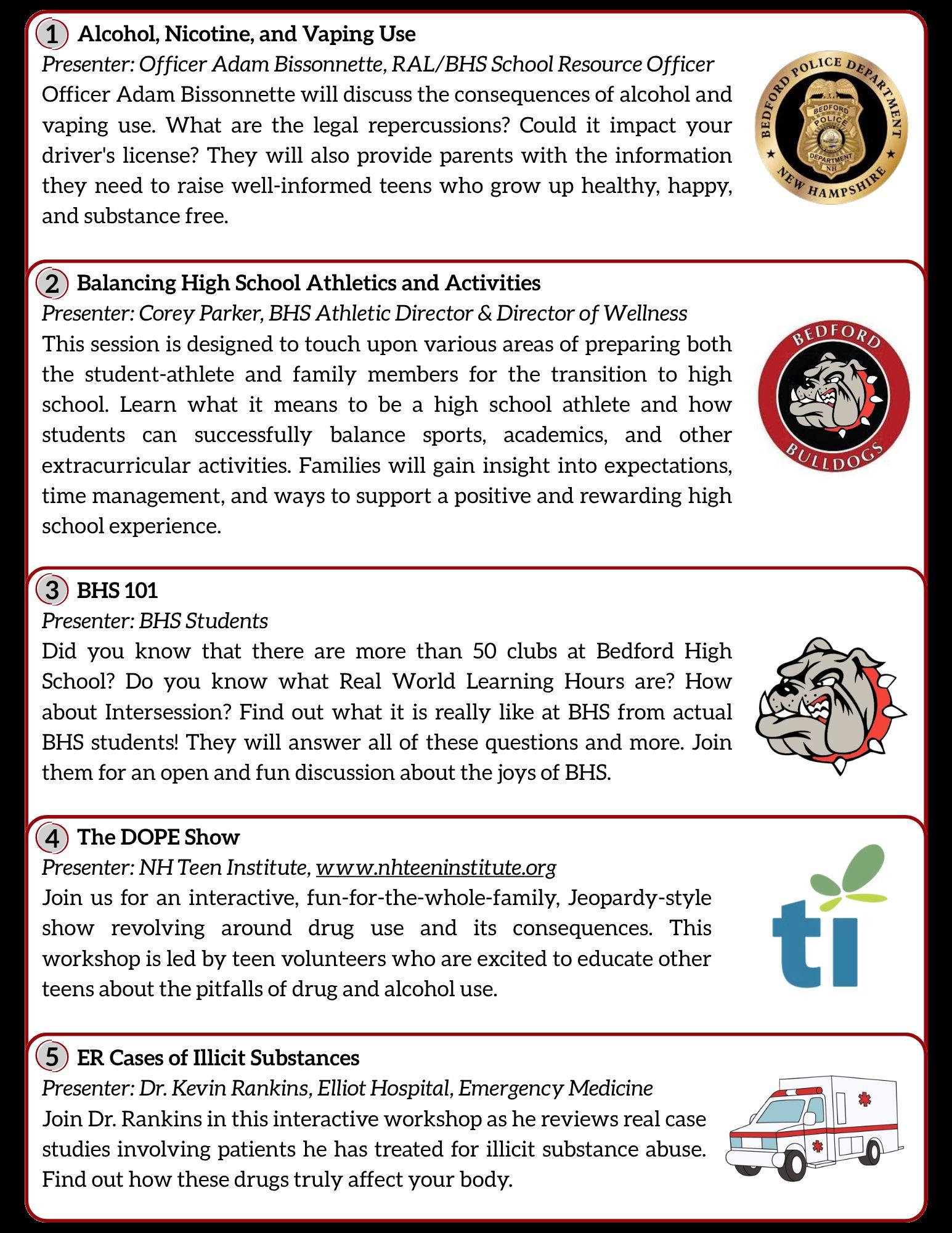 Did you know that there are more than 50 clubs at Bedford High School? Do you know what Real World Learning Hours are? How about Intersession? Find out what it is really like at BHS from actual BHS students! They will answer all of these questions and more. Join them for an open and fun discussionaboutthejoysofBHS.