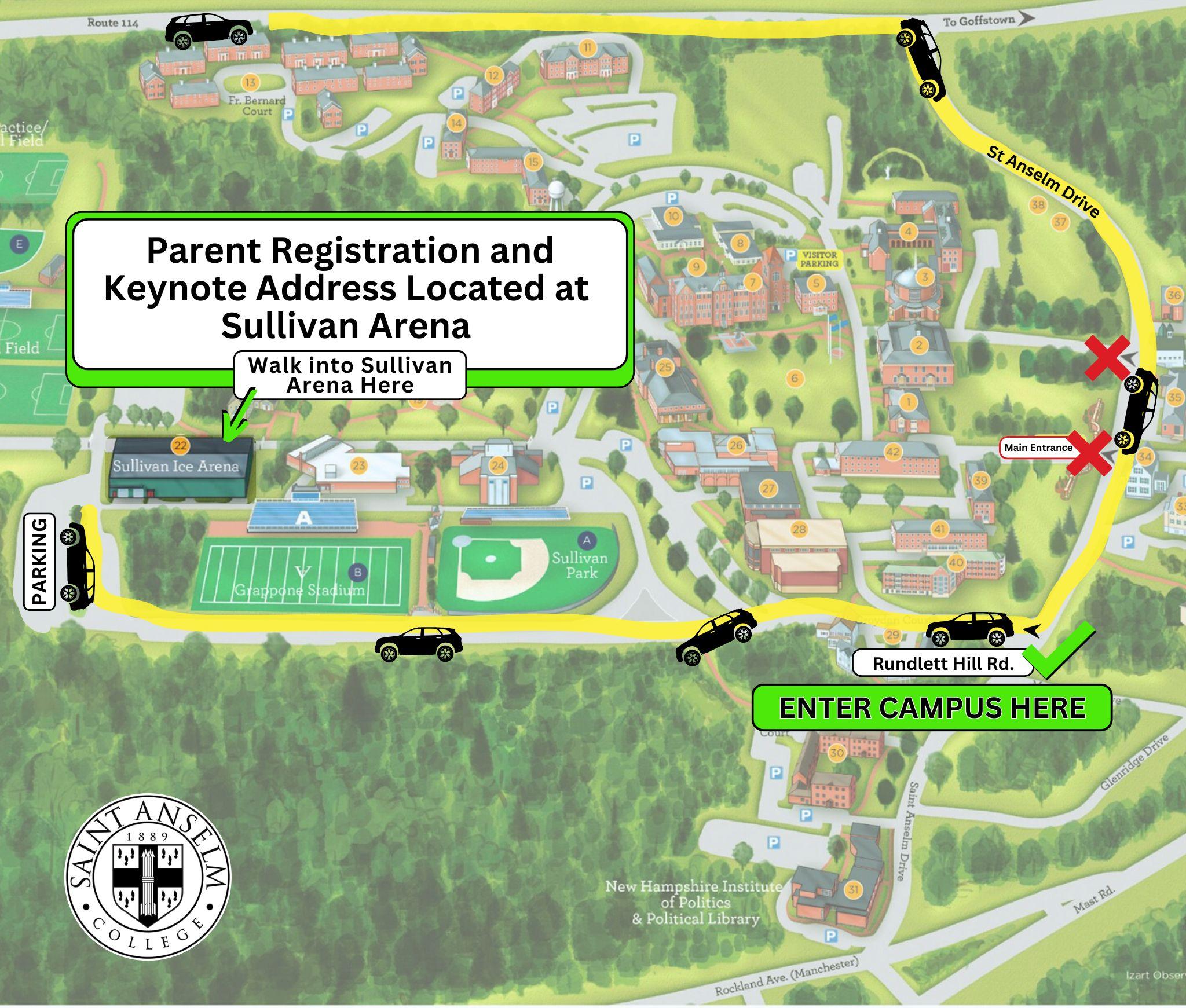 St. Anselm College is located at 100 Saint Anselm Drive, Manchester, NH 03102. If you’re using your phone or GPS for directions, it may tell you to enter through the Main Entrance on College Road. DO NOT enter here—there are multiple gates that could block your route to Sullivan Ice Arena where you will be checking in for the keynote address.