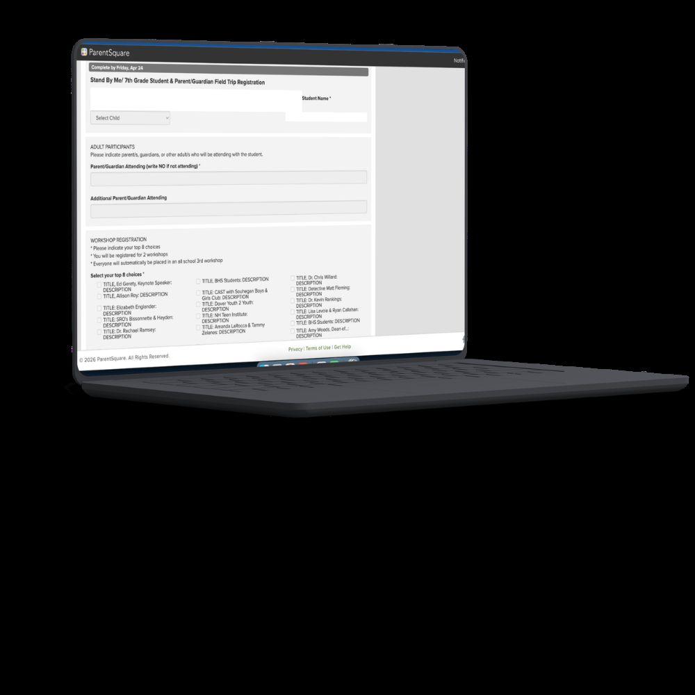 You will register online through the Stand By Me registration link that Principal Joyce will email directly to 7th grade families. Parents/Guardians should register all attendees in the family under one account in the online registration system.