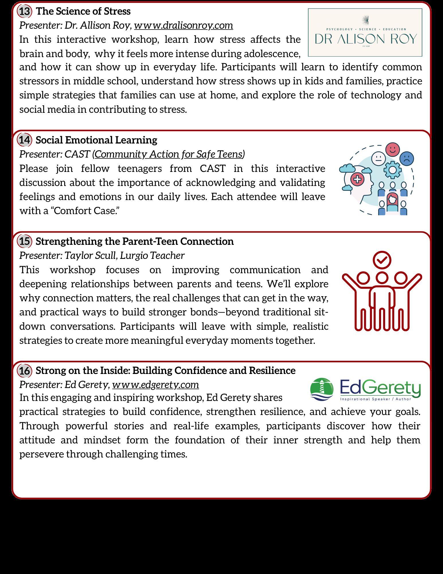 This workshop focuses on improving communication and deepening relationships between parents and teens. We’ll explore why connection matters,therealchallengesthatcangetintheway,andpracticalwaystobuild stronger bonds—beyond traditional sit-down conversations. Participants will leave with simple, realistic strategies to create more meaningful everyday momentstogether.