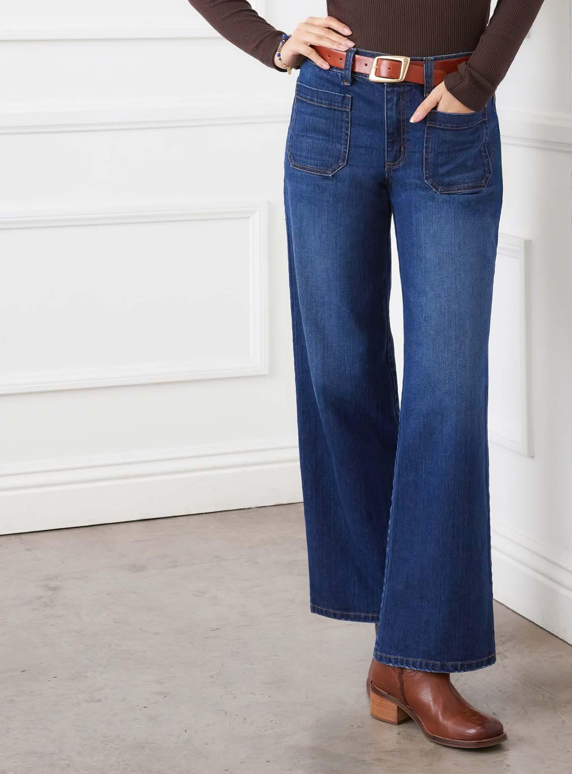 Lauren Patch Pocket Jeans A flared silhouette with two front patch pockets and contrast stitch detail. 99% Cotton, 1% Spandex. Washed indigo denim. Made in USA of imported fabric. L66509 sizes 2 - 16 $148