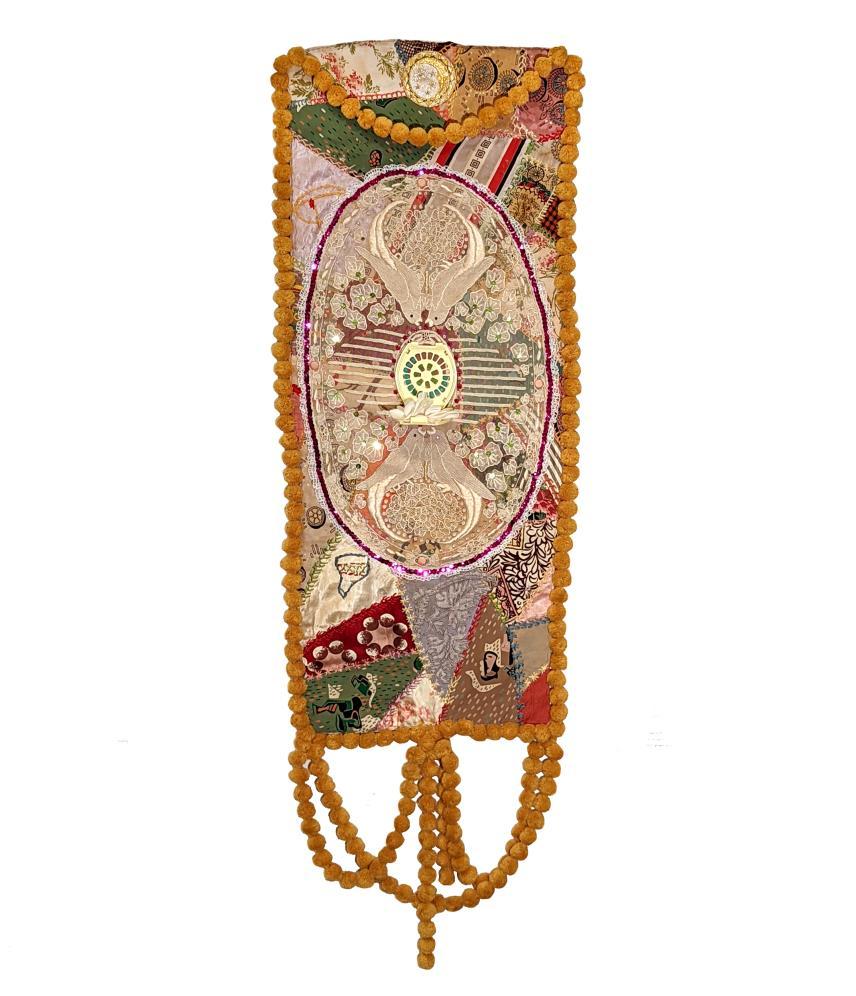Transformation II, (2020), Silk sari, acrylic paint, batting, 36 x 36 x 3 inches