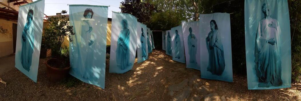 100 Women: Collaborations Beyond the Veil presents large scale photographic banners of contemporary women to address the historical lack of visibility of women in public space. Unlike singular bronze or stone statues that valorize men as heroic, via war or conquest, this chorus of women suggests another kind of monument that is non-hierarchical, fluid and transparent, interdependent and connected. Originally conceived to mark the 100th anniversary of the United States’ 19th Amendment, the banners are a gesture to offset the present gap and encourage future representation of real women, rather than as abstract attributes such as chastity or virtue, or muses for others. Each woman stands with a hand to the heart and one on the abdomen, to acknowledge and honor these seats of wisdom long disavowed by patriarchy.