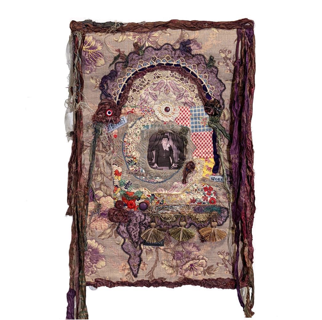 The Nature Regeneration Series is my primary work about feminine power and the persistence of life. Frightening environmental changes are happening all around us, but I believe Nature is fierce and will reproduce and regenerate to heal the ailing planet…with or without us. The Wonderment Series begins with a question to tackle whatever might be puzzling or troubling me at the moment. It could be Prejudice, Feminism, Global Warming, Suburban Sprawl, Motherhood, or Plastic Surgery. I wonder, ”How do I really feel about the subject?” While I work, the art often answers my questions and clarifies my feelings. 100 Years and Waiting examines the process involved in attempting to pass equal rights legislation and how long that wait continues. A victorian bodice was deconstructed to create a backdrop for feminist quotes from the past and present by Lucrecia Mott and Michelle Obama calling for change, highlighting how long women have been fighting for equal rights under the law. This piece is in response to a piece constructed by Gail Smuda with a 1920s flapper dress using quotes addressing the ongoing fight to pass the Equal Rights Amendment. Gail and I collaborate together as the Loosely Knit Alliance collective.