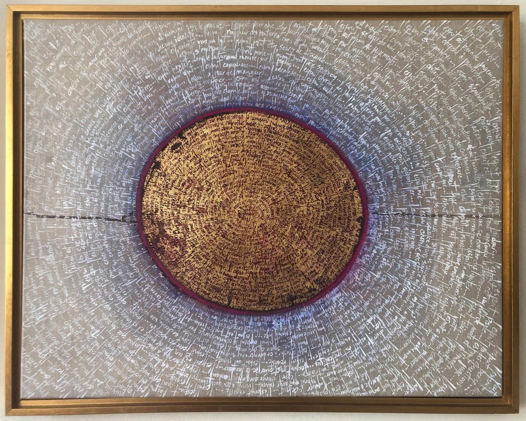 into personal growth, self-actualization, and transcendence through meditation.” Cecile Picard’s “OpeningoftheHeart “is an inward voyage, a meditation on the qualities of the heart and the mind such as: the mind wants, the heart knows. This painting is a portal to the core of our being, inviting the viewer to introspect and marvel!” I am mesmerized with the circling text and drawn in, wanting to learn the secrets in the golden center.