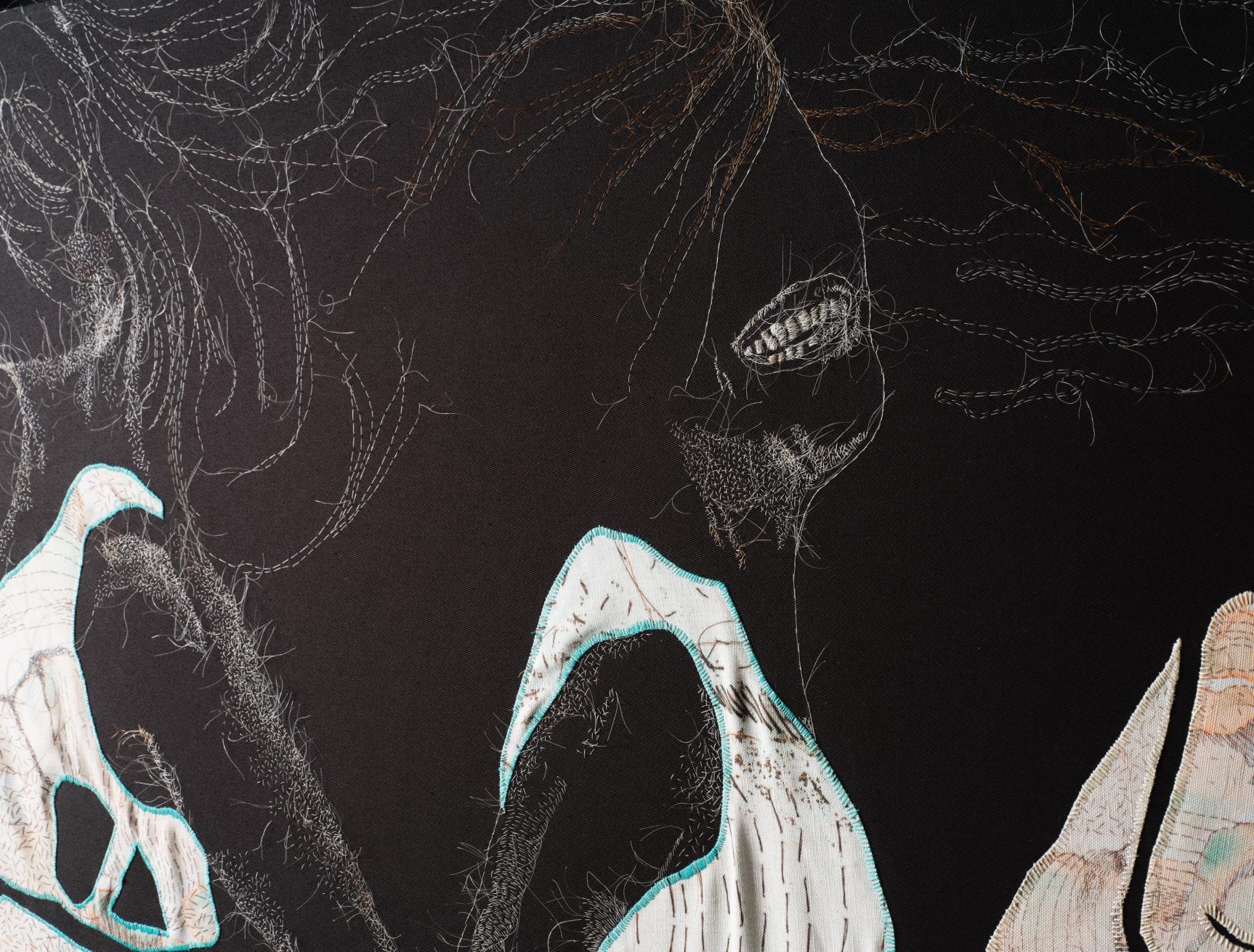 Graces, Nalgonas, Marias 2022-2023, Hand-sewn human gray hair, specialty fabric with thread on black twill fabric 34” x 38” x 2.25”