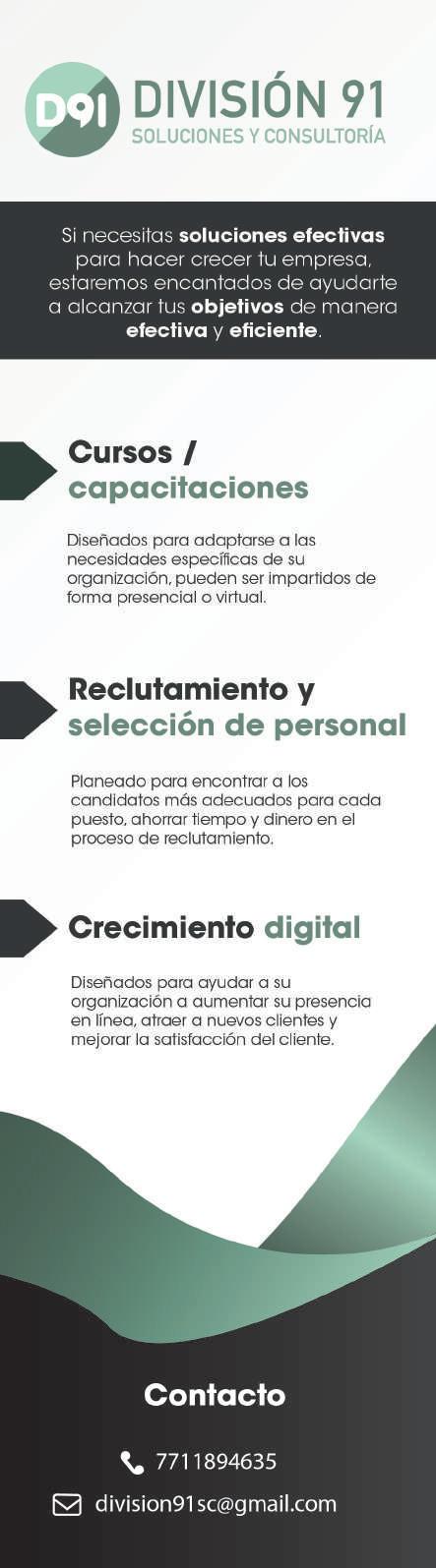 “Consultoría”, Año 14, Núm. 14, correspondiente al período anual de Julio 2023 a Junio del 2024. Editada por Héctor Ramos Romero. Domicilio de la publicación: Paseo de Los Cipreses #188 Col. Paseos de Taxqueña. Alcaldía Coyoacán C.P. 04250 Ciudad de México. Reserva de Derechos al Uso Exclusivo No. 04-2013-053010005100-102. Impreso en los talleres de Racsy, Antiguo Camino a Culhuacán #87 Col. Santa Isabel Industrial, Iztapalapa, CDMX, C.P. 09820, Número de Certificado de Licitud de Título y Contenido: No.15240. Los invitamos a seguir Revista Consultoría a través de los Formatos Digitales: Issuu y Joomag, así como en nuestras redes sociales. Distribución: Mensajería especializada. Todos los derechos reservados. Prohibida cualquier reproducción sin autorización expresa de los editores.