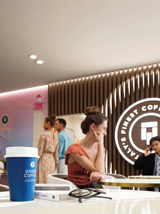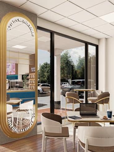 La atmósfera es juvenil y fresca , con colores claros que se convierten en protagonistas y aportan luz y dinamismo. Más allá de ser una cafetería, el proyecto se concibe como un punto de encuentro entre el arte y el café, donde la experiencia cotidiana se mezcla con lo inspirador.