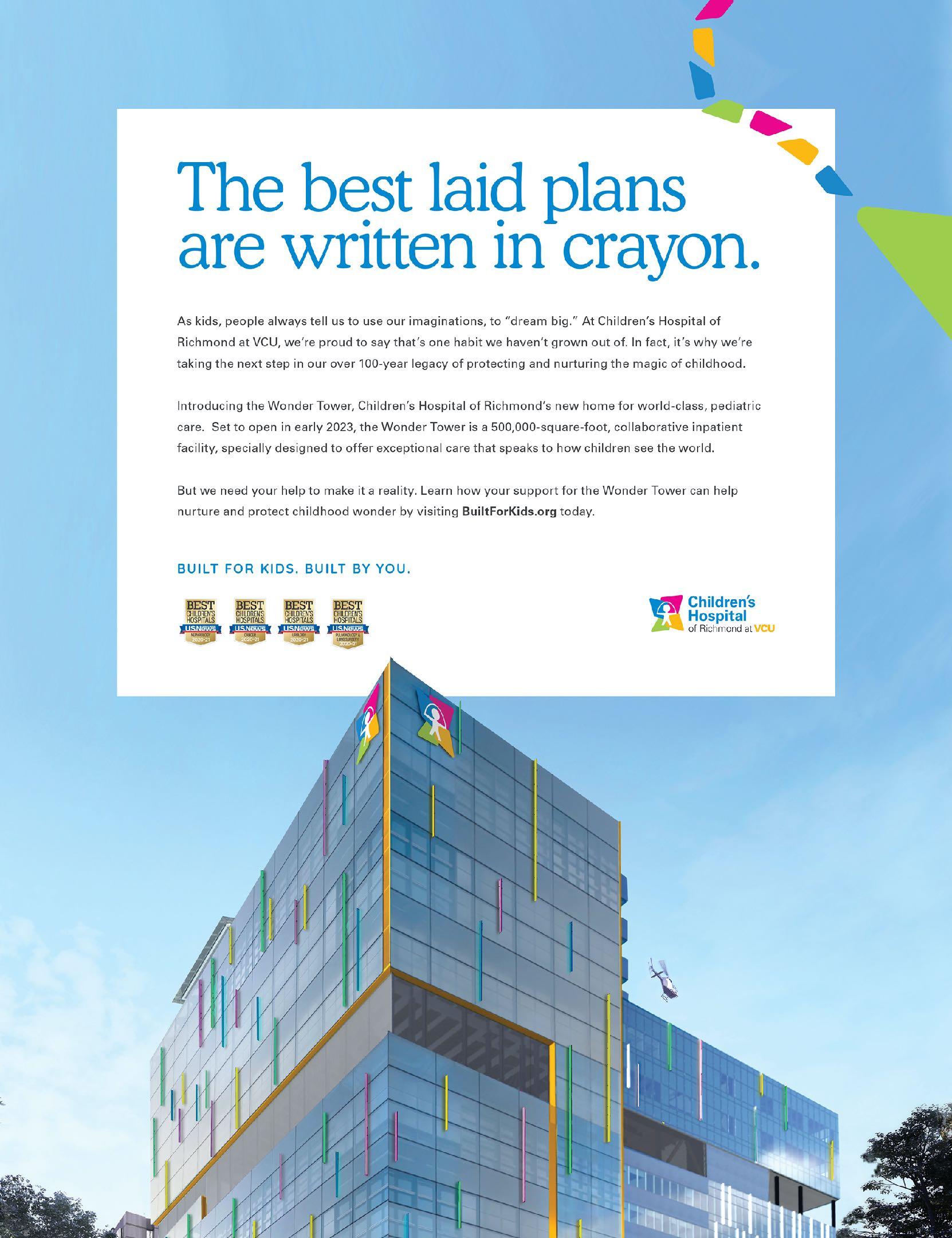 A series of campaigns designed to raise funds and awareness for Children’s Hospital of Richmond’s new pediatric facility. From the naming of the building, to specific donor outreach, events, activations, and mass media awareness, they have resulted in an eightfigure surge in support.