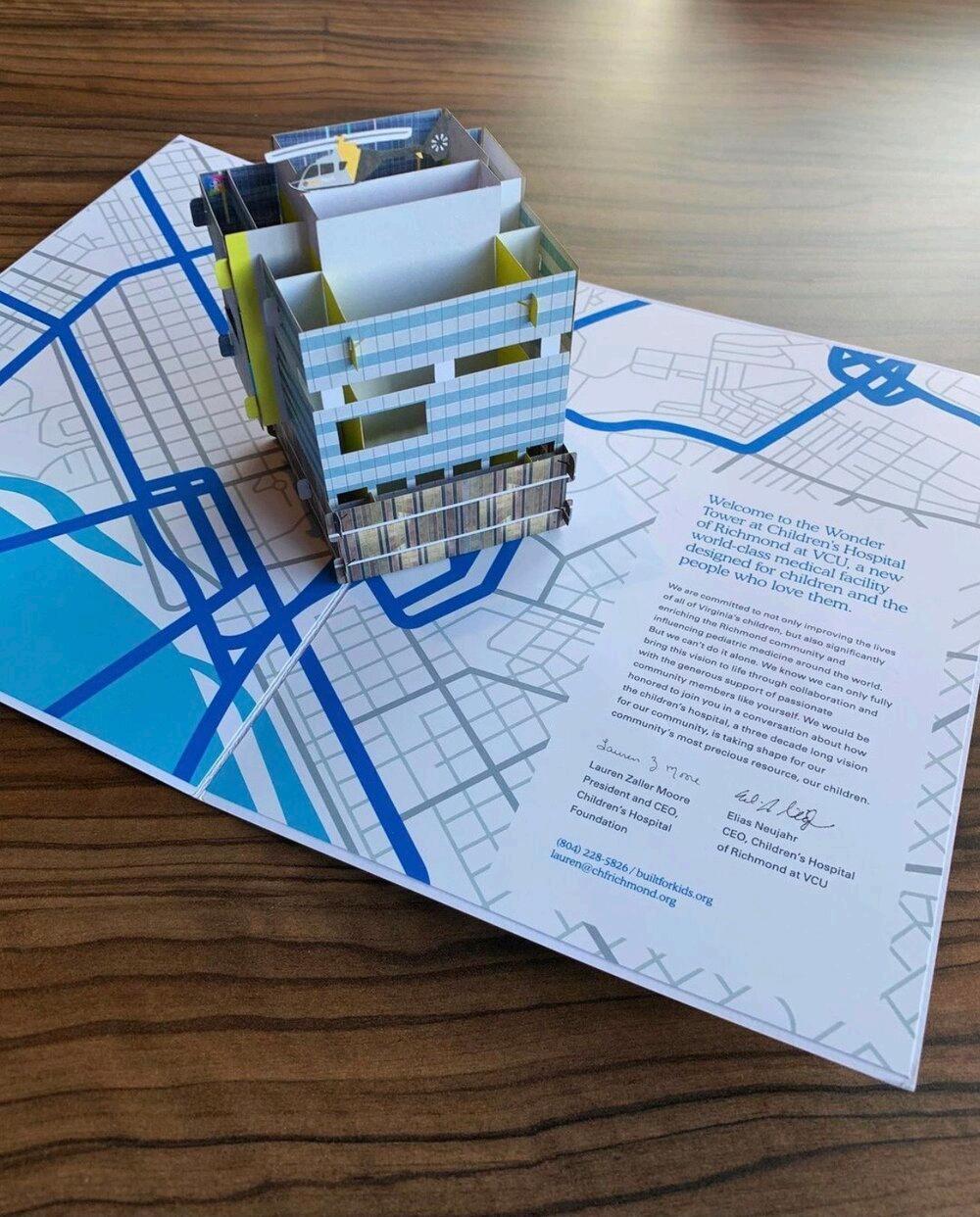 We also surprised prospective donors with custom laser-cut pop-up cards that feature the new building.