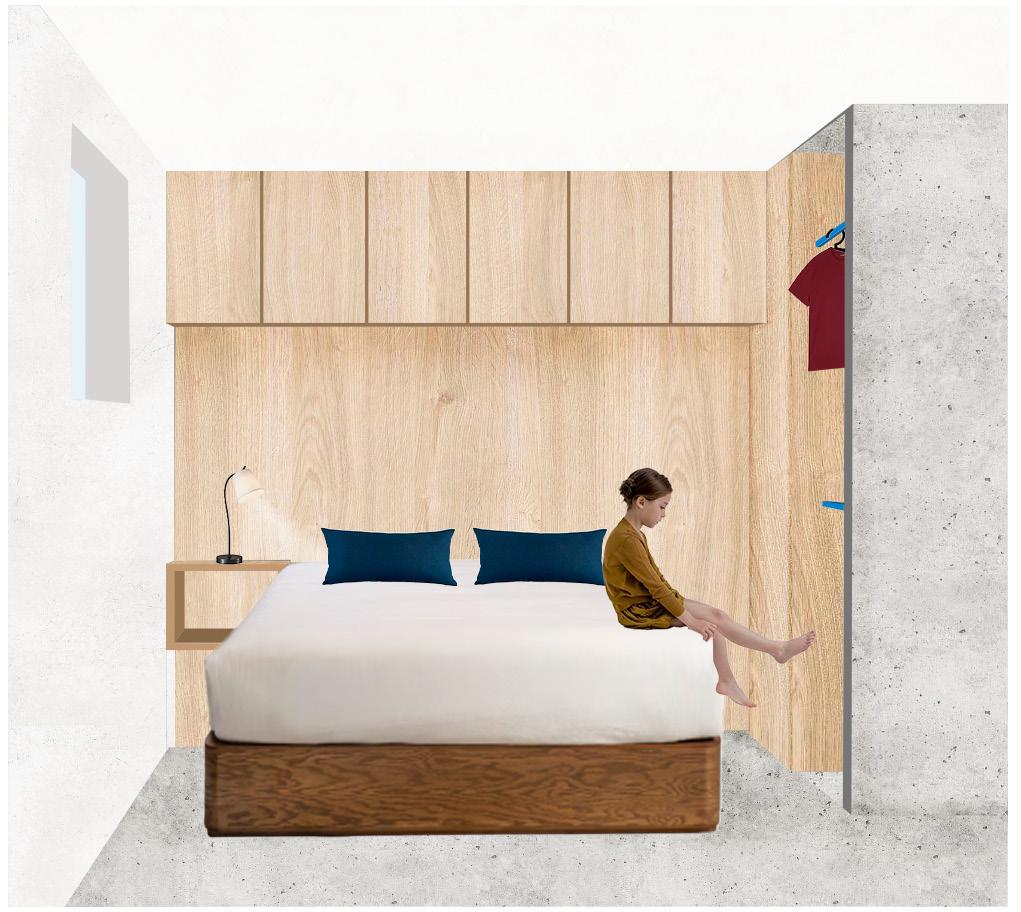 Las recámaras cuentan con clósets abiertos que, además de almacenamiento, funcionan como elementos divisorios entre habitaciones, reduciendo el uso de muros y permitiendo ampliar la percepción de espacio y la circulación interior.