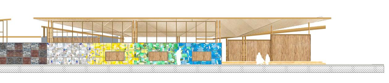 El sistema estructural se compone de elementos de bambú anclados al terreno mediante pequeñas zapatas que permiten su estabilidad y contacto controlado con el suelo. La estructura se arma a partir de amarres que conectan los elementos verticales y horizontales, conformando el soporte del techo. Para asegurar la rigidez del sistema, se incorporan elementos diagonales de bambú que funcionan como arriostramientos entre los soportes principales.