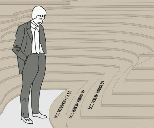 Nachdem der Erste Schritt in den Pavillion getan wird, eröffnet sich einem eine Installation, zum Großteil bestehend aus Treppen und Plattformen. Jede Stufe symbolisiert dabei einen CO2 Anstieg von 23 m3. Dieser Wert ist auf den Trittflächen niedergeschrieben. Durch die Form des Pavillions wird der Besucher dazu verleitet weiter hinauf zu gehen. Auf dem Weg nach ganz oben summieren sich die Werte, bis 550 m3 erreicht sind.