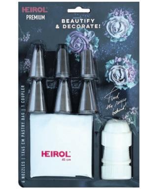 Premium pursotussetti sisältää kuusi eniten käytettyä tyllaa, tyllaliittimen sekä pestävä pursotinpussi, joiden avulla eri väristen pursotusten teko on helppoa.