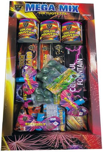 välkkeitä, perhosia, hyrriä. Runsaasti rätinää Uuden vuoden juhlintaan. Y, O, J, L, I, .com 29 90 Macrocosmos 2 ja Macrocosmos 3 patacombo Komeettoja, tähtikuvioita, värejä ja efektejä. Upea kokonaisuus Uuden vuoden juhlintaan. 2 näyttävää pataa. Huom! myynnissä myymälöissä 27.12-31.12 välisenä aikana. Y, O, J, L, I, .com Norm. à 12,90 20 00 -22% Mix Of fountains suihkulajitelma Neljä erilaista pienen kokoluokan näyttävää suihkua. Kulta, hopea, rätinä ja moniväri. Koko perheen iloksi! Kesto 20 sek Y, O, J, L, I, .com 10 90 Gold kartiosuihku Tuuhea , korkealle nouseva ja pitkään palava kultainen suihku. Hiljainen ja kaunis tuote! Y, O, J, L, I, .com 1390 Mars - Big Bang pata Rätinä- sekä pioni-efektejä tuuheiden pyrstöjen saattelemana. Monipuolinen ja vaikutuksen tekevä tulite. Y, O, J, L, I, .com 1790 Big Thunder king ilotulite Nimensä mukainen legendaarinen suuri ilmapommi, markkinoiden näyttävimpiä! Y, O, J, L, I, .com 8 95 Pikkukivaa! /2kpl /2kpl Bingo 100 palloa ilotulite Legendaarinen 100 laukauksen roomalaispata. Tuote on hiljainen, värikäs ja soveltuu kaikenikäisille katsojille! Kesto: 16sek. Y, O, J, L, I, .com Norm. à 5,90 10 00 -15%