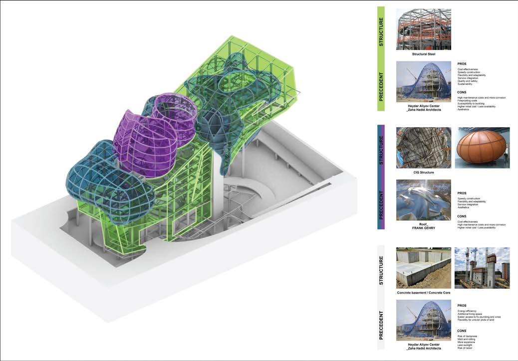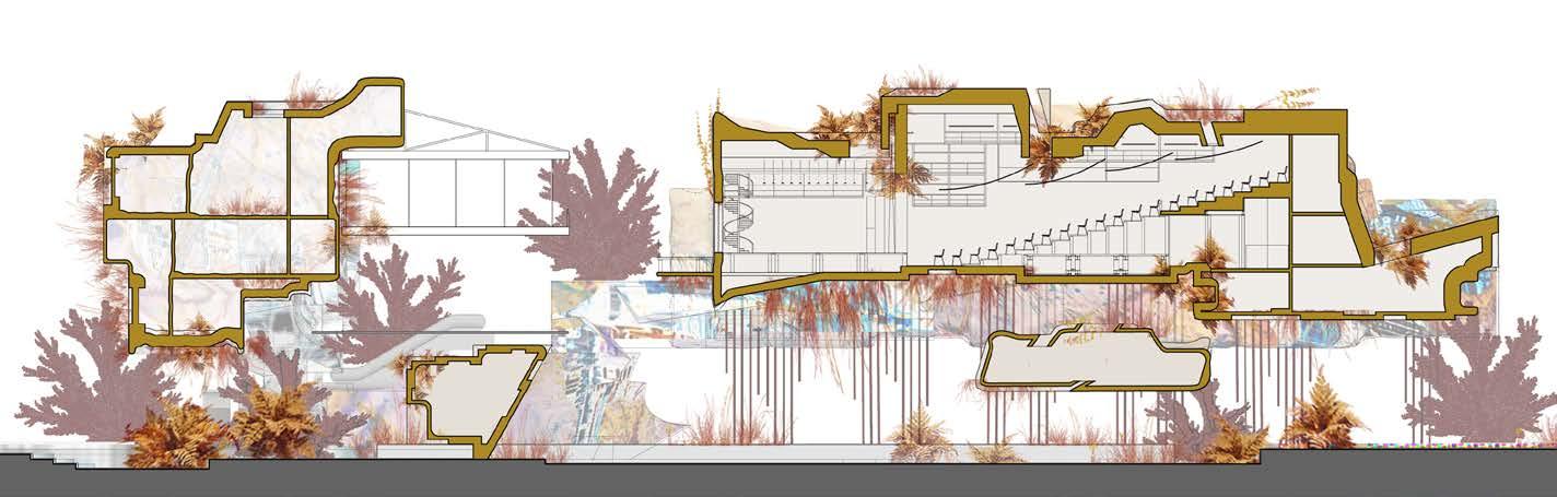 It is conceptualized into three layers of strata each containing a performance space, two informal ones and a main auditorium. This conglomerate of triple strata decentralizes the performances by genres, each connecting to its adjacent supplementary functions such as education, rehearsals or archiving.