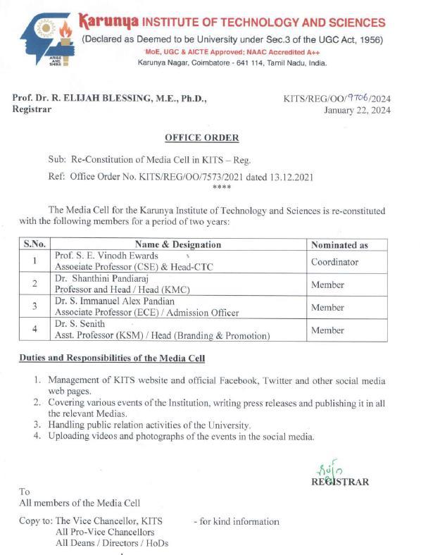 Karunya Institute of Technology and Sciences, (Deemed to be University), Karunya Nagar, Coimbatore - 641 114, Tamil Nadu, India. registrar@karunya.edu 9487846516