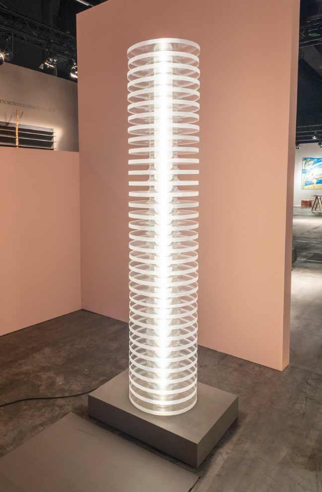 Only a few of these very experimental prototypes were created as the electrical circuit was extremely fragile. The visual language is completely foreign to the formal “codes” of Memphis. This series referenced and was born out of the “animism” of nature and objects. Made of “electro-luminescent” material, the lamps diffused a soft and vibrant light, and lit up as if it were alive, magical, mysterious. —Andrea Branzi