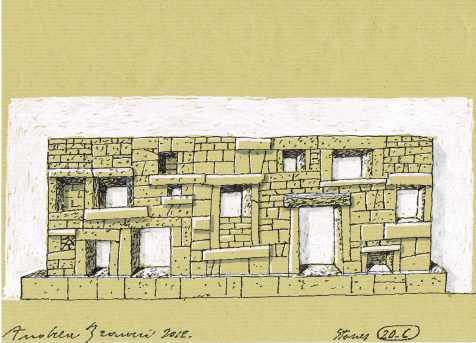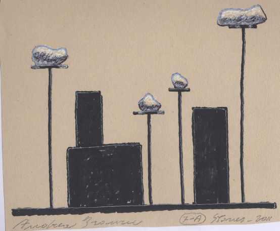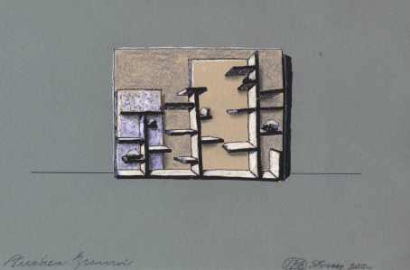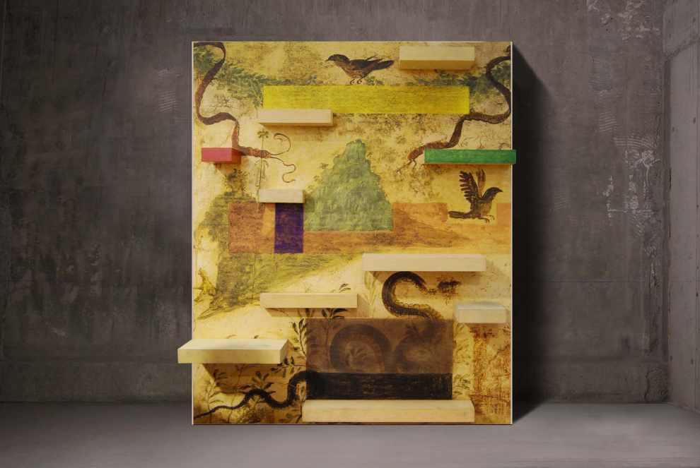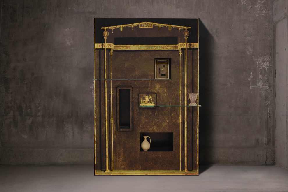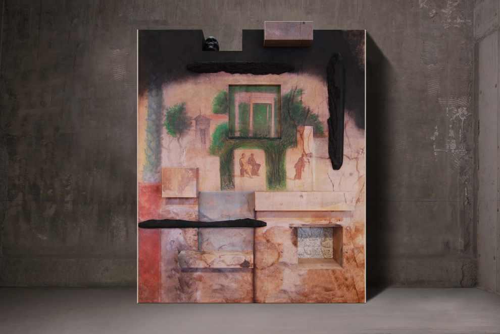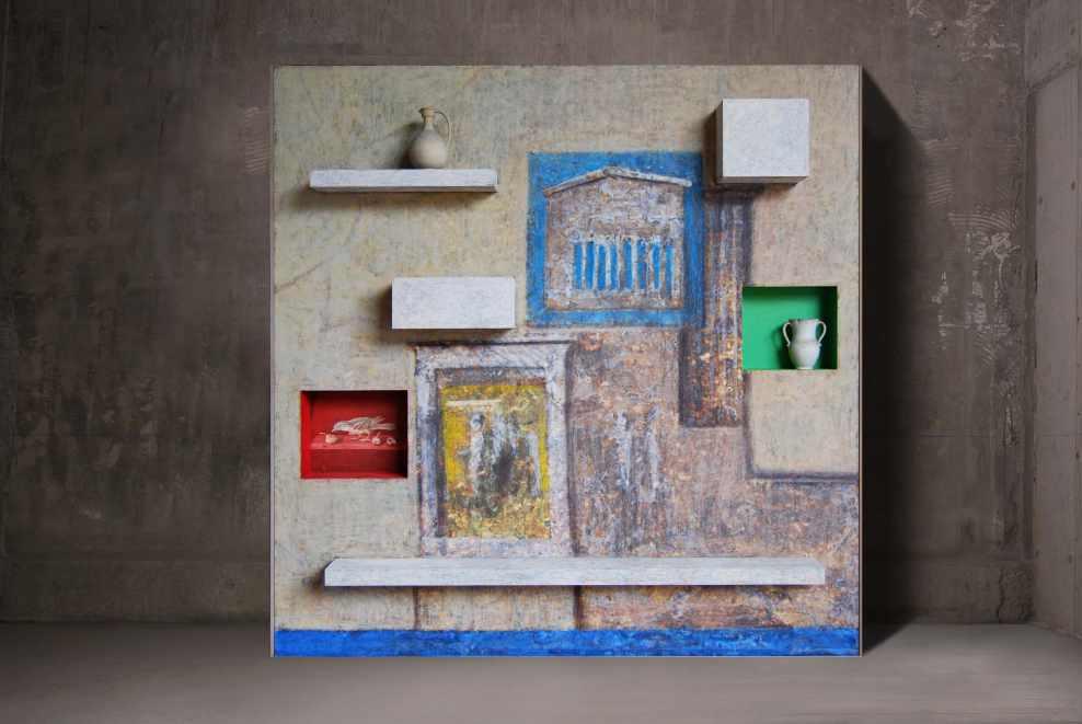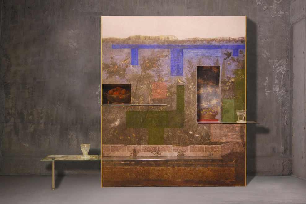 Branzi’s archetypal language reached a high refinement in the Walls collection (2013), poetic and pictorial works possessed of a somber gravitas. Executed in the delicate medium of chalk on canvas, and featuring domestically scaled still-life vignettes, they recall the metaphysical style of Giorgio de Chirico, but also the frescoes of Pompeii, or trecento Florence. There is a riddling, rebus-like quality to the arrangements. Despite the evident precision of placement, it is as if they could be manipulated at will, like shelved walls in an actual domestic space. In their temperament, the Walls are as close as Branzi has come to the melancholic historicism that defined much postmodern practice—born of a collapse of faith in the modernist myth of progress. That ideal was replaced by a perpetual motion that is also a form of stasis, as in ancient civilizations—in his words, “a return to circular time, that is, a time when everything changes, however without development.”
