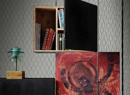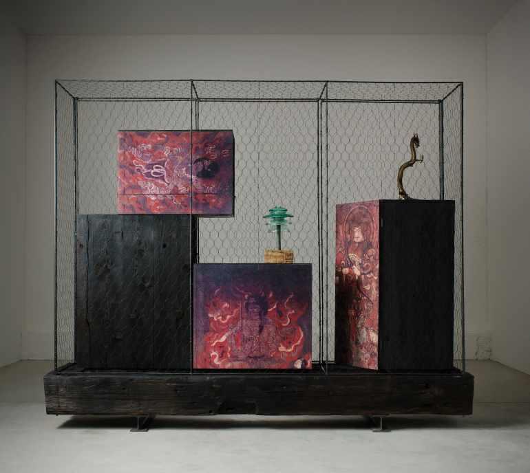 with three-door metal frame and basis with beams being rough-hewn by hand and burnt; Inside four cabinets burnt massive larch reproducing paintings on silk on the door