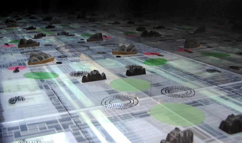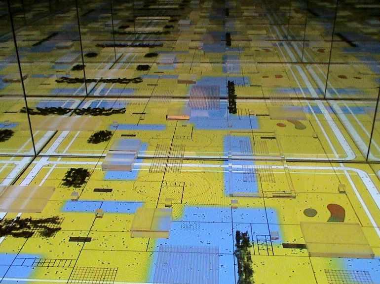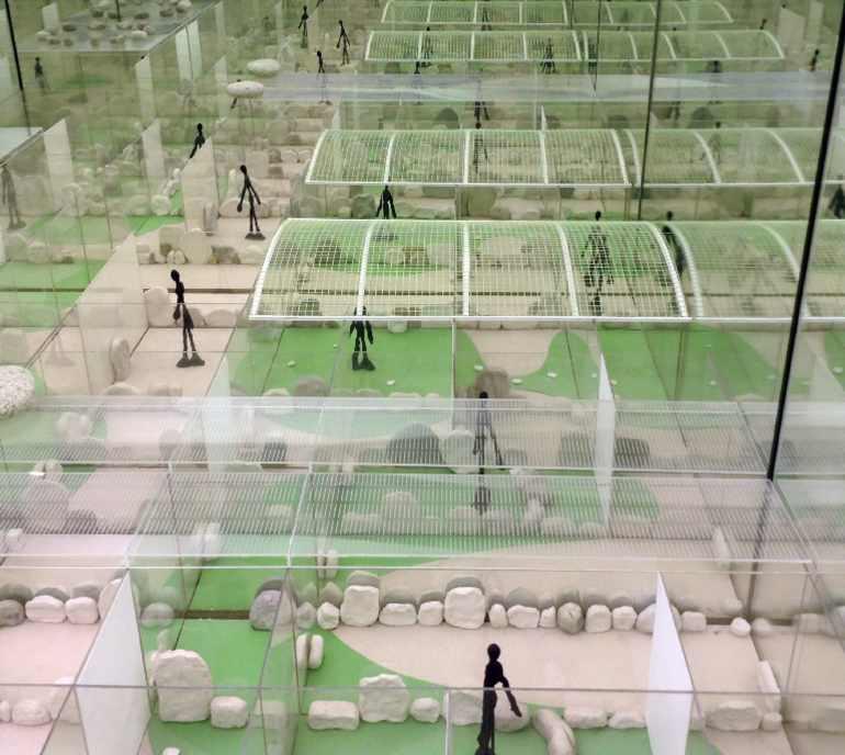 These have taken many formats, including full-scale fragments (as in the recent Arazzo series, 2017) of a possible infinite architecture—another idea adapted from De Stijl. The most important, however, is his sprawling, ambitious ongoing series Territories, Branzi’s continued meditation on the metropolis. Physically, these are more or less the same: mirrored dioramas which extend into phantasmagoria. The intellectual reach of the project is vast, however, the logical deductions of fifty years of speculation. Each Territory is its own discrete research project, often exploring the interaction of biotechnology, agriculture, manufacture, and residential life. A summary of these investigations is far beyond the scope of the present essay, but one idea (put forward in Branzi’s Genetic Metropolis project, 1988-2006) leaps out as representative: if the modernist city was a set of boxes, his vision is of a space akin to a textile, which can be folded in different configurations so that its various surfaces touch. The city is a fabric, which can give a little when put under pressure. It’s a revelatory conception, one that we might bear in mind when we feel that contemporary life threatens to carry us away from one another, on drifting tides.