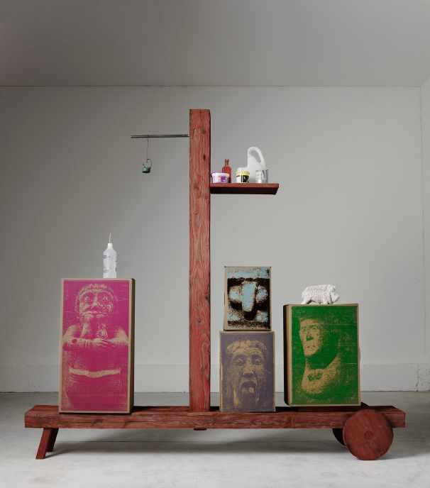 Movable frame on wheels, made of ancient beams with hand-made cuts and joints; On the structure, four cabinets in thick cardboard with serigraphs on the doors