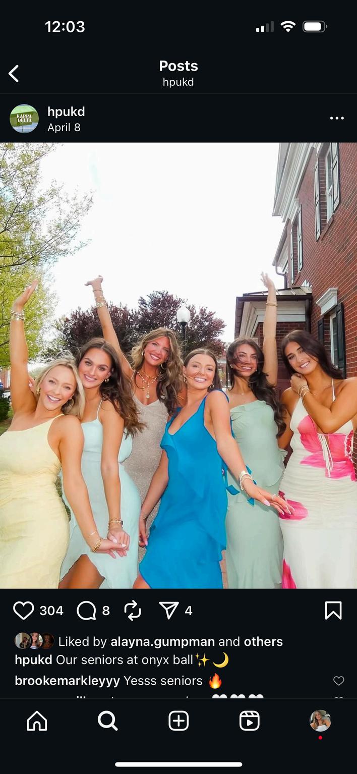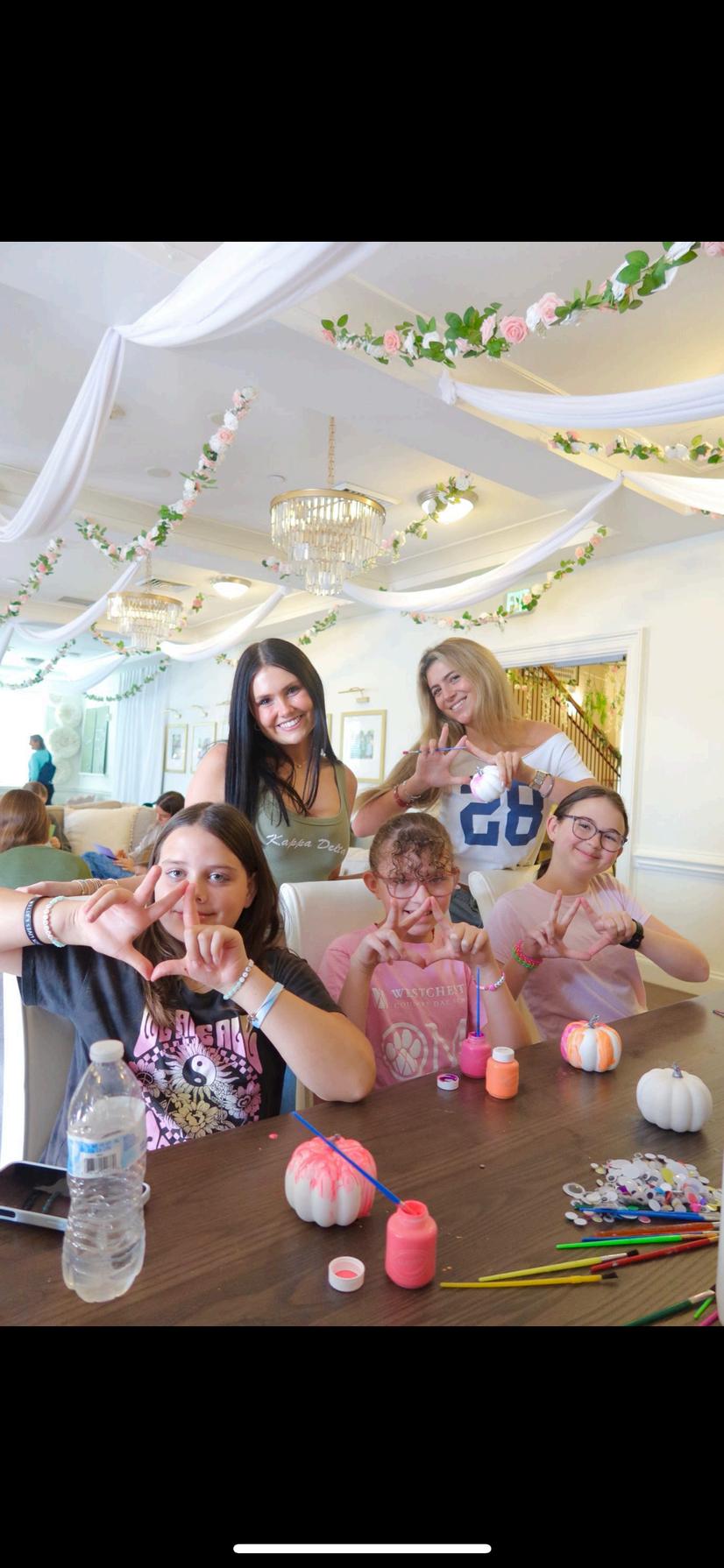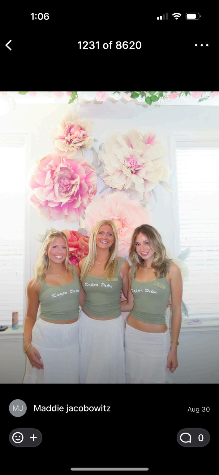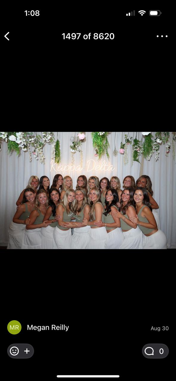 Our house absolutely stunning thanks to your house decorations committee led by junior interior design student Olivia Wenzel This year, the Kappa Delta house was transformed into an enchanting showcase of elegance and sisterhood Every detail reflected our values with silk ribbons tied around each chair, soft blush and white roses with baby’s breath draped from the beams, and four crystal chandeliers casting a warm glow The foyer featured pleated curtains framing a floating LED “Kappa Delta” sign, while the mantle and kitchen overflowed with florals, pearls, and oversized vases of floating pearls From framed photos of our sisters and philanthropy Girl Scout handprints to handmade floral walls and soft green accents, every space told our story of our why KD, a true return to our roots in timeless “Elegant KD” style