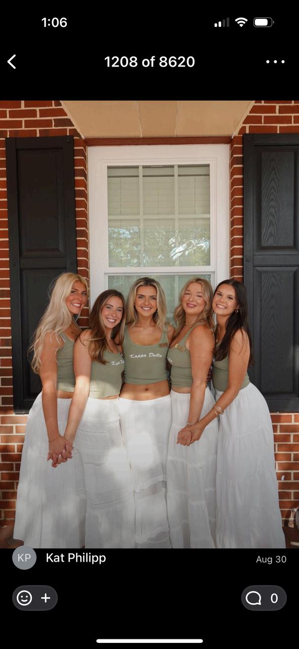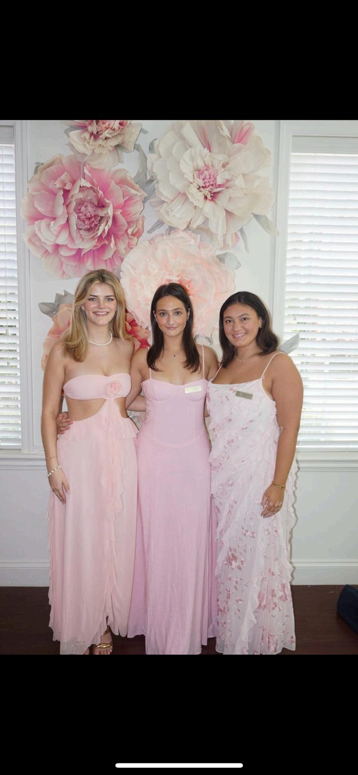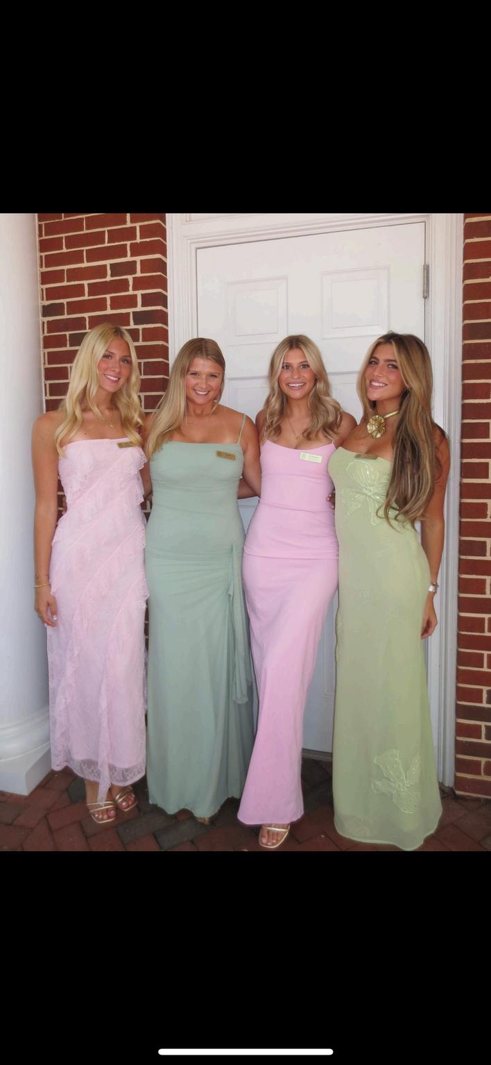 Thanks to our outfits chair Reilly Gallagher our sisters looked elegant and classy For sisterhood round our sisters were in white linen skirts, dainty gold jewelry, gold heels and a custom olive green tank top For philanthropy round, our sisters were in a mix of pink and green long dresses to match perfectly with the colors of the house Our tradition of wearing white dress still remains as our sisters were in beautiful long white dresses for preference round.