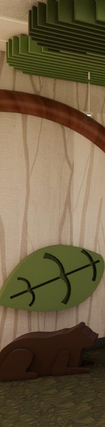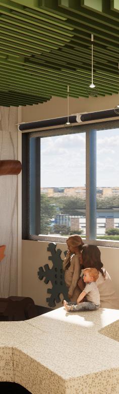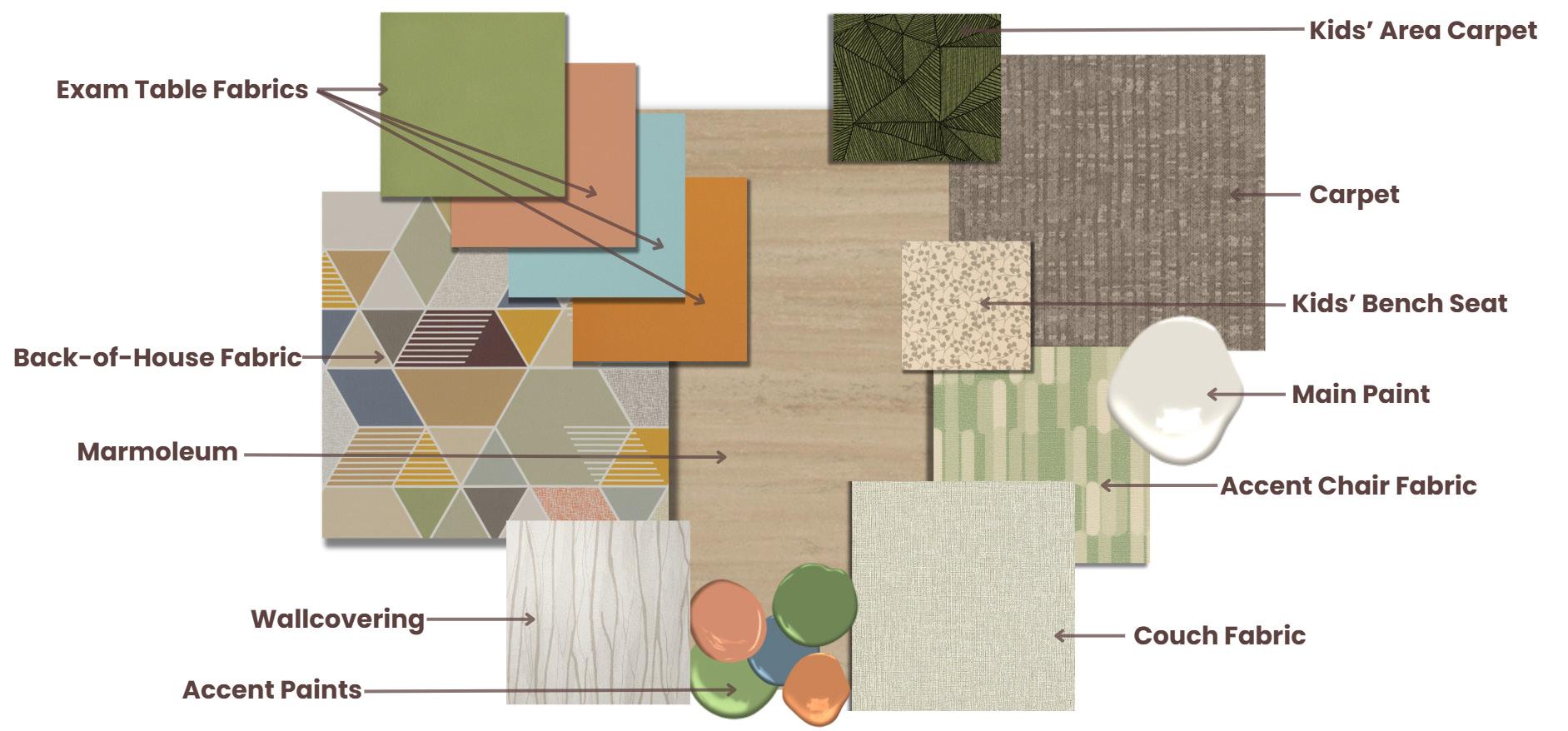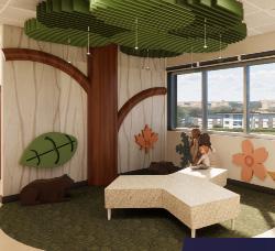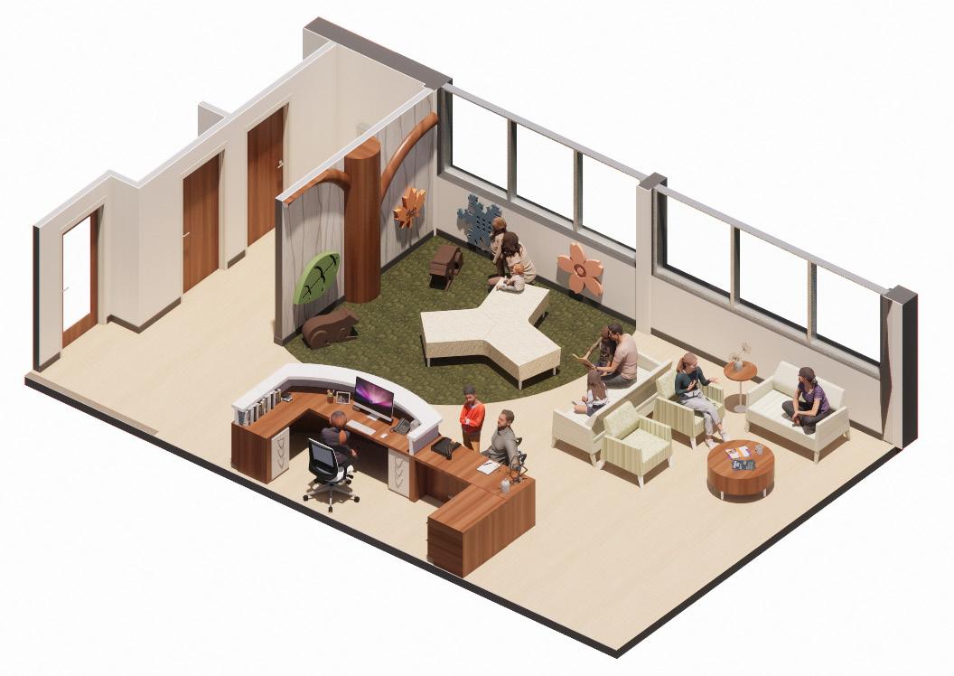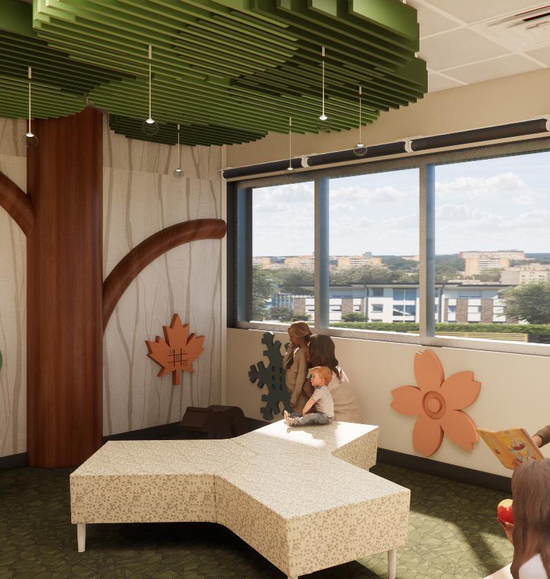 Inspired by the key colors of the seasons, each room is themed to mimic the time of year. Bright colors in treatment rooms aid in both wayfinding and engaging child interest. Public spaces use a simplistic, neutral palette with green accents representing the growth of trees.