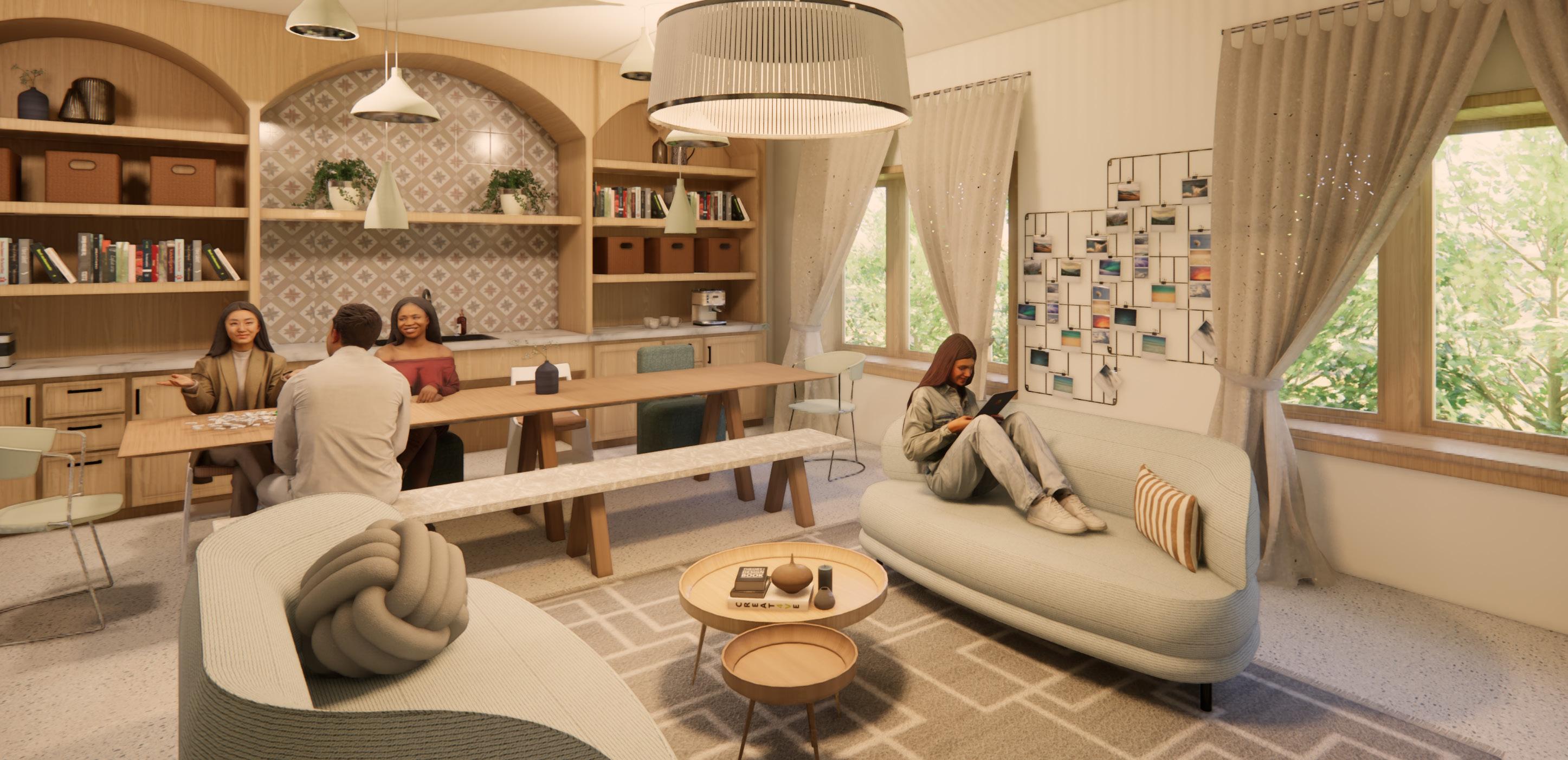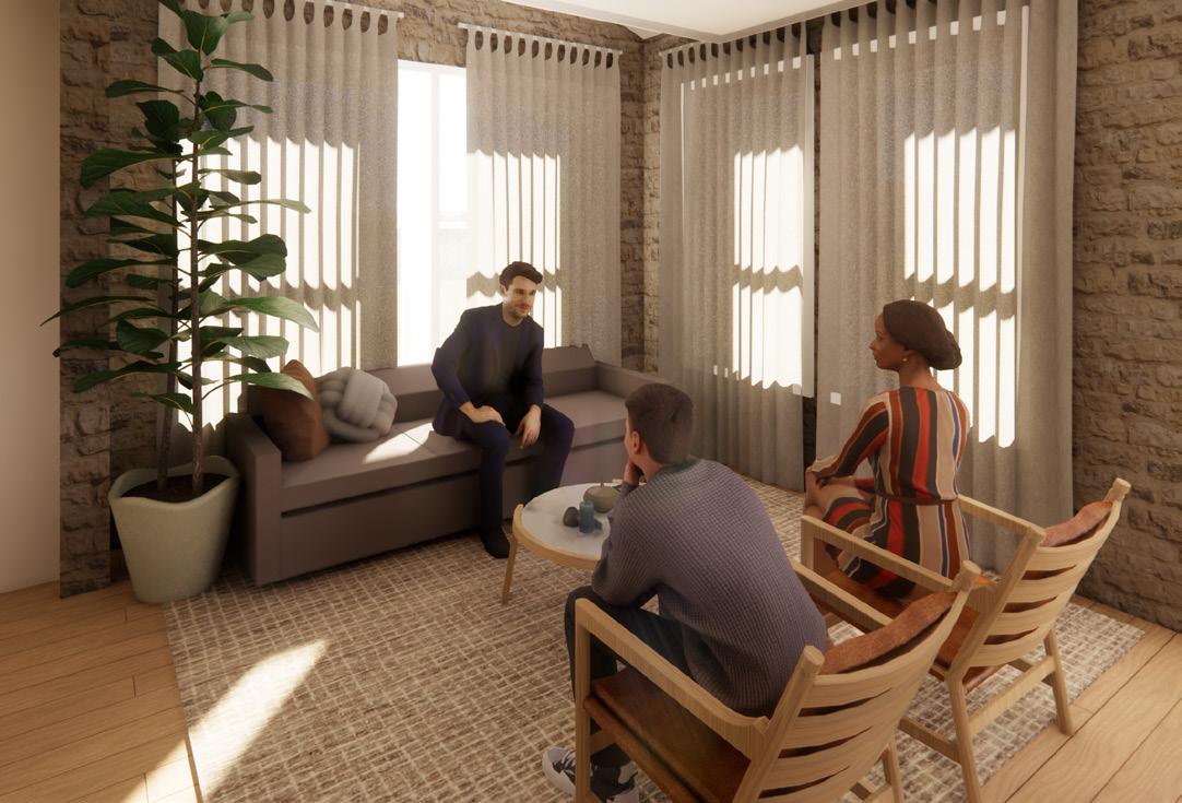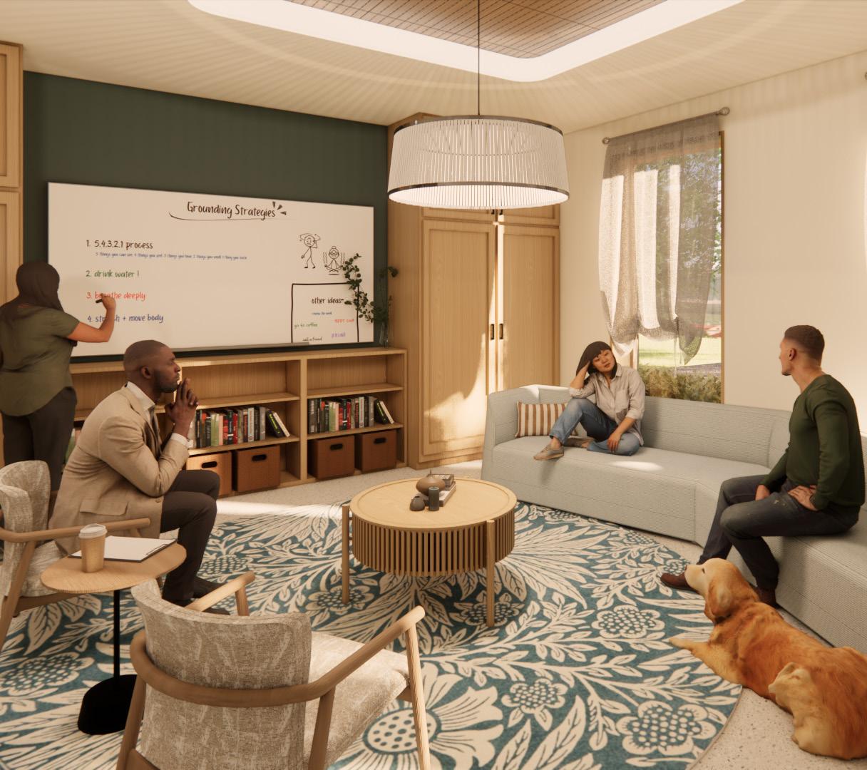 The group therapy room uses soft, sociopetal seating to encourage comfortable dialogue and peer connection. A neutral, low stimulus palette supports calmness and emotional regulation, while varied textures add gentle visual interest without overwhelming users. Soft window treatments and adjustable lighting provide sensory modulation and allow for user choice and adaptability, accommodating a wide range of sensory needs.