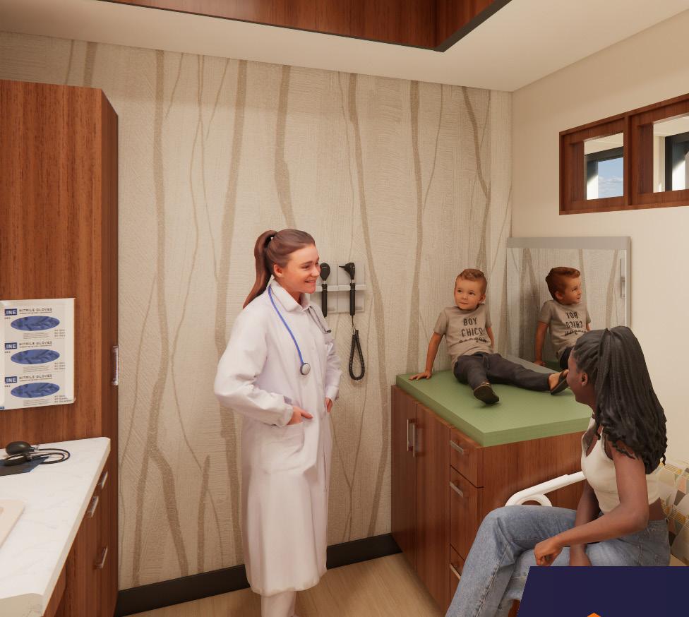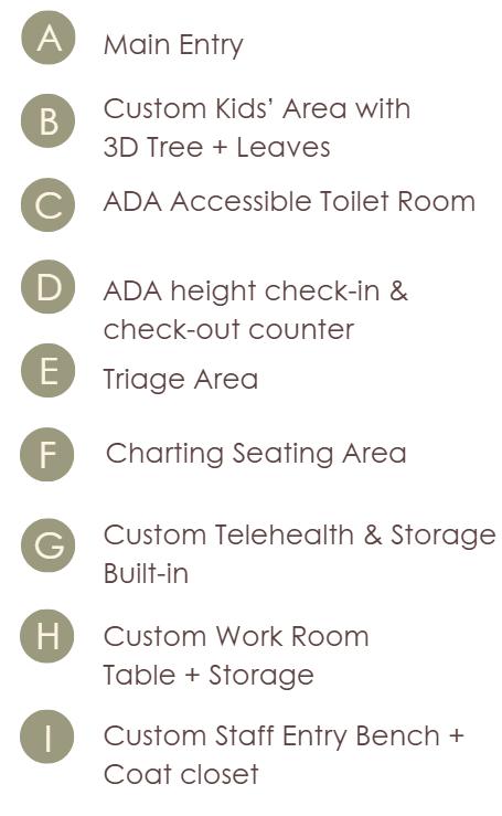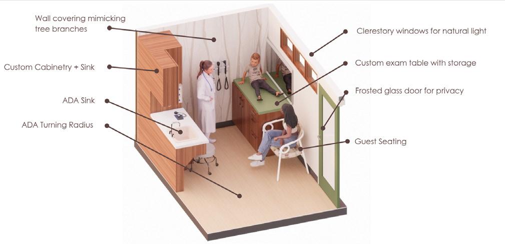 Each patient room is grounded by a recessed wood soffit -- mimicking the rings of a tree. Custom cabinetry and exam tables allow for increased function for the activities necessary. All rooms are ADA accessible with an ADA sink and turning radius.