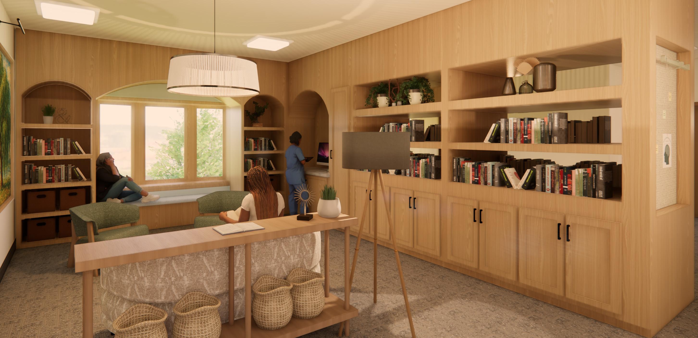 The Nurse’s library blends essential clinical functions with a warm, residential atmosphere to reduce stress and promote social inclusion. Varied seating, from soft, living room arrangements, to hard-surface tables supports adaptable social interactions. Built-in window niches offer a place of refuge and sensory recharge for patients and guests.