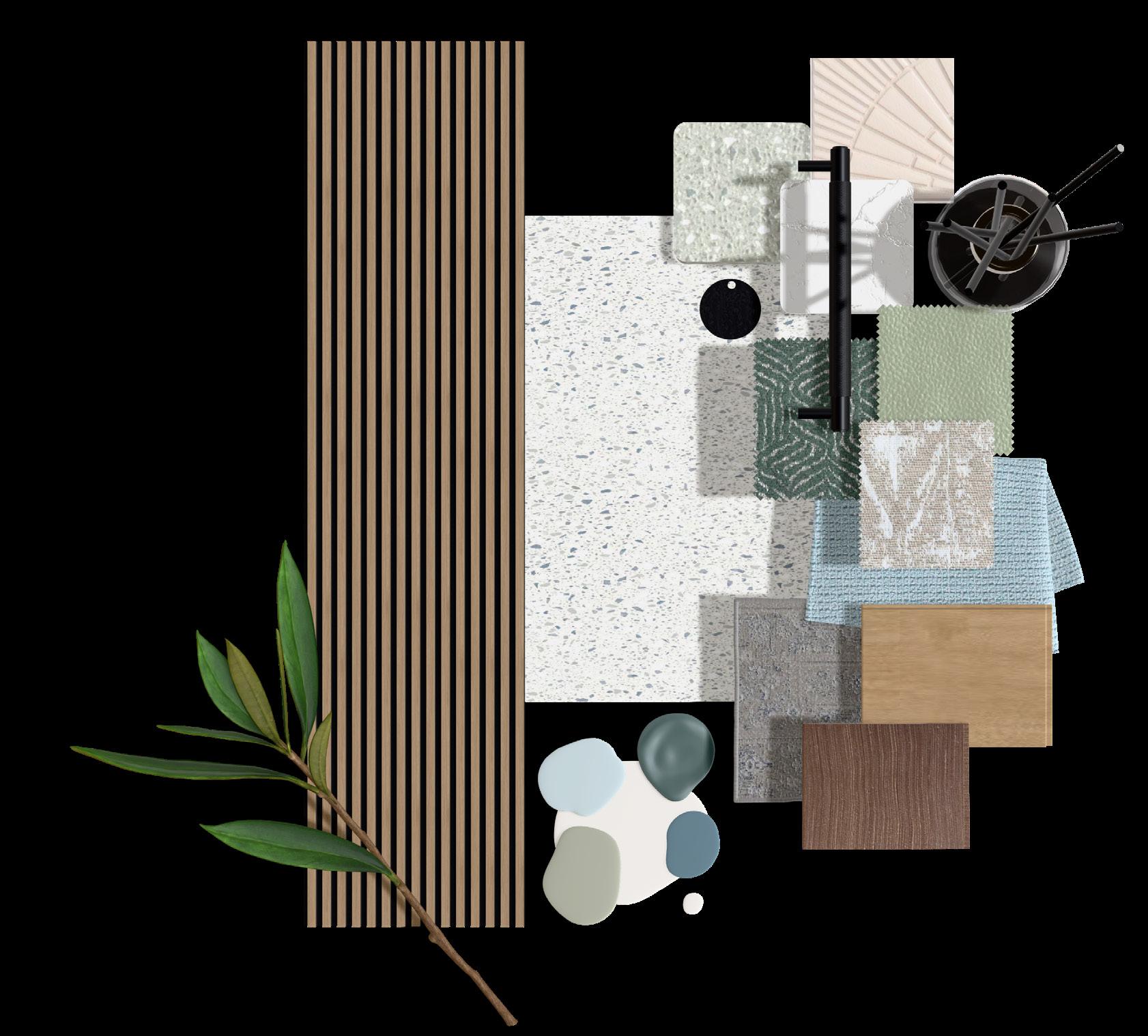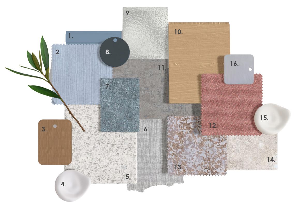 Low stimuli hues, like soft blues and greens, provide visual interest without overstimulating TBI patients. Textiles incorporate simple, easy-to-process patterns and textures that support comfort and clarity. Light wood elements ground the space in a subtle connection to nature, reinforcing a calming restorative atmosphere.